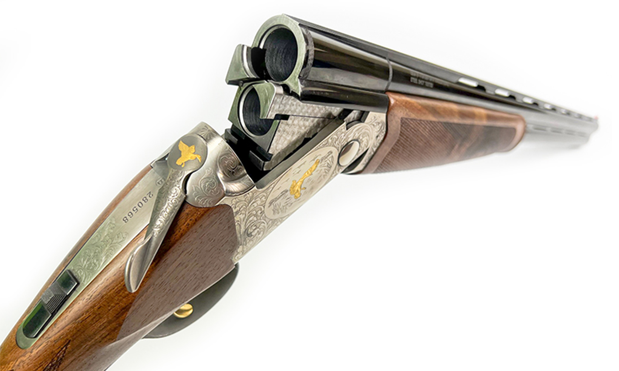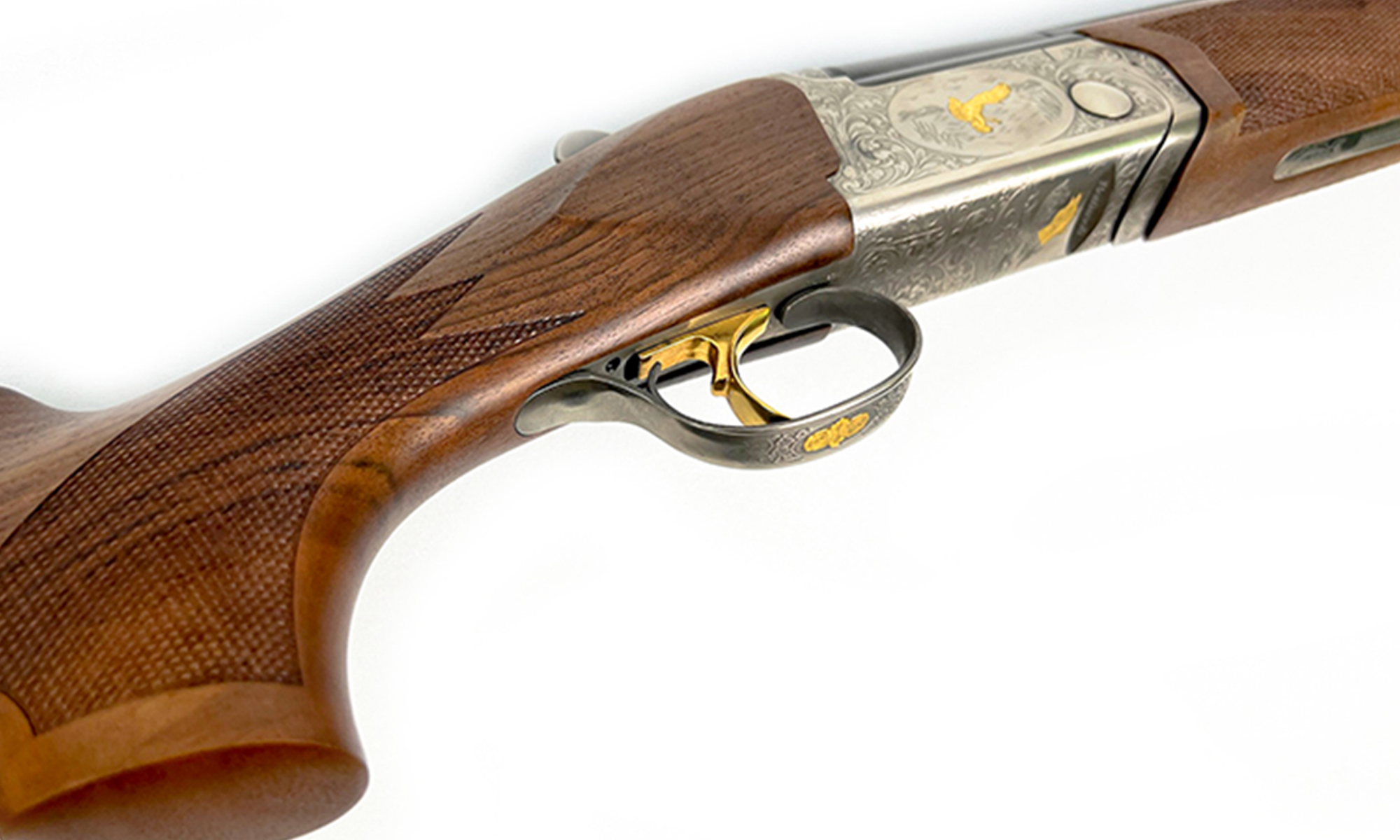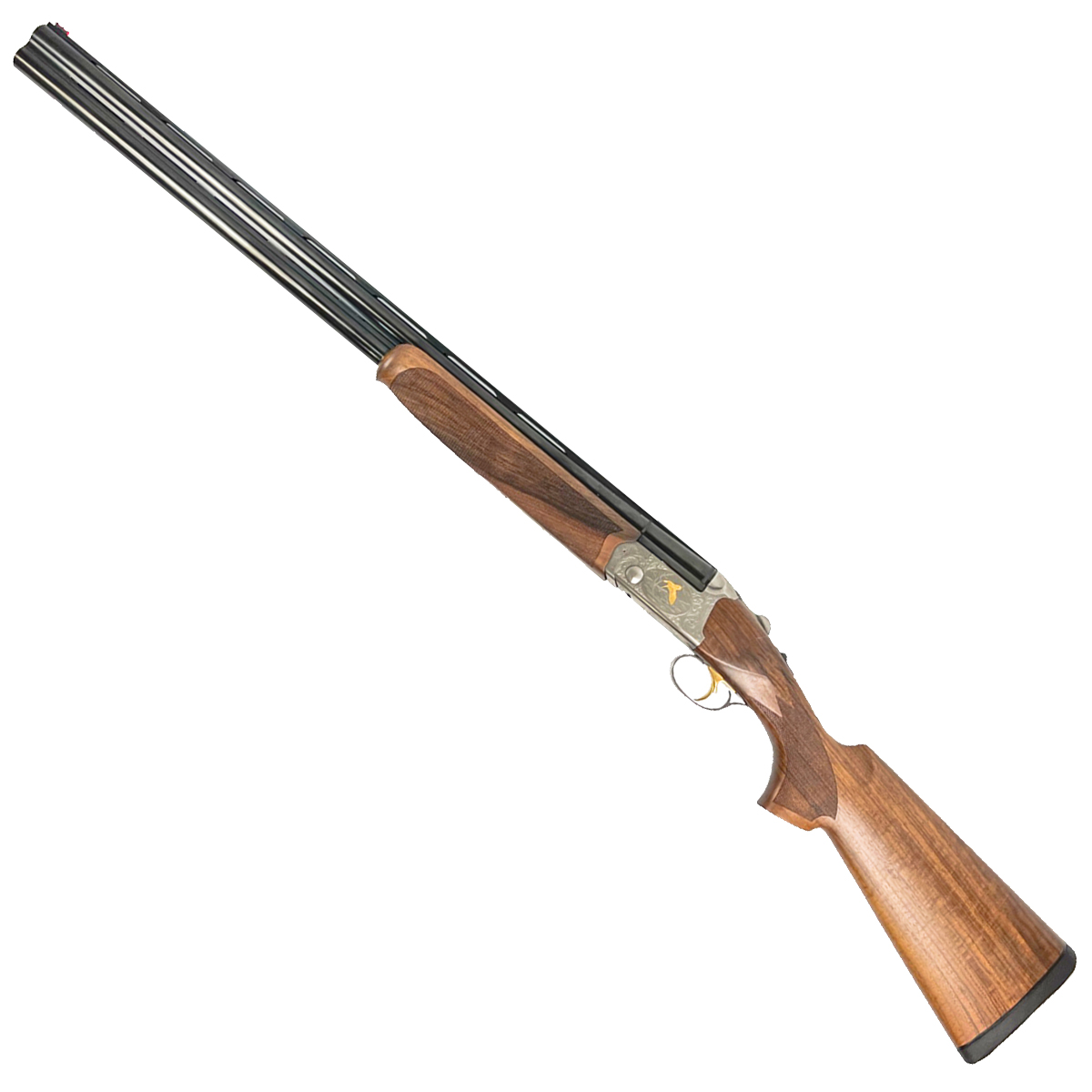 Estetică și Calitate: Bascula argintie este decorată cu gravuri laser reprezentând motive cinegetice subtile. Patul este realizat din lemn de nuc selecționat, oferind o priză ergonomică și un aspect premium.
