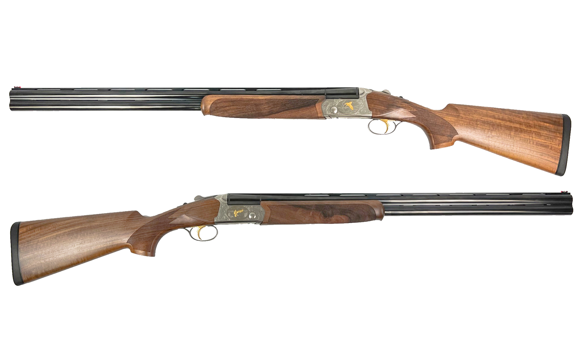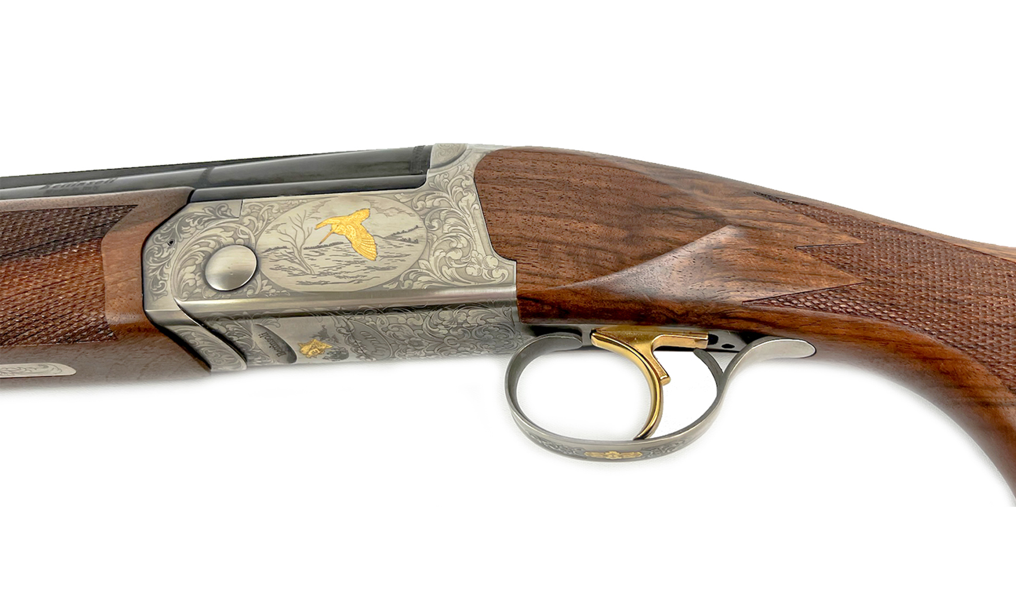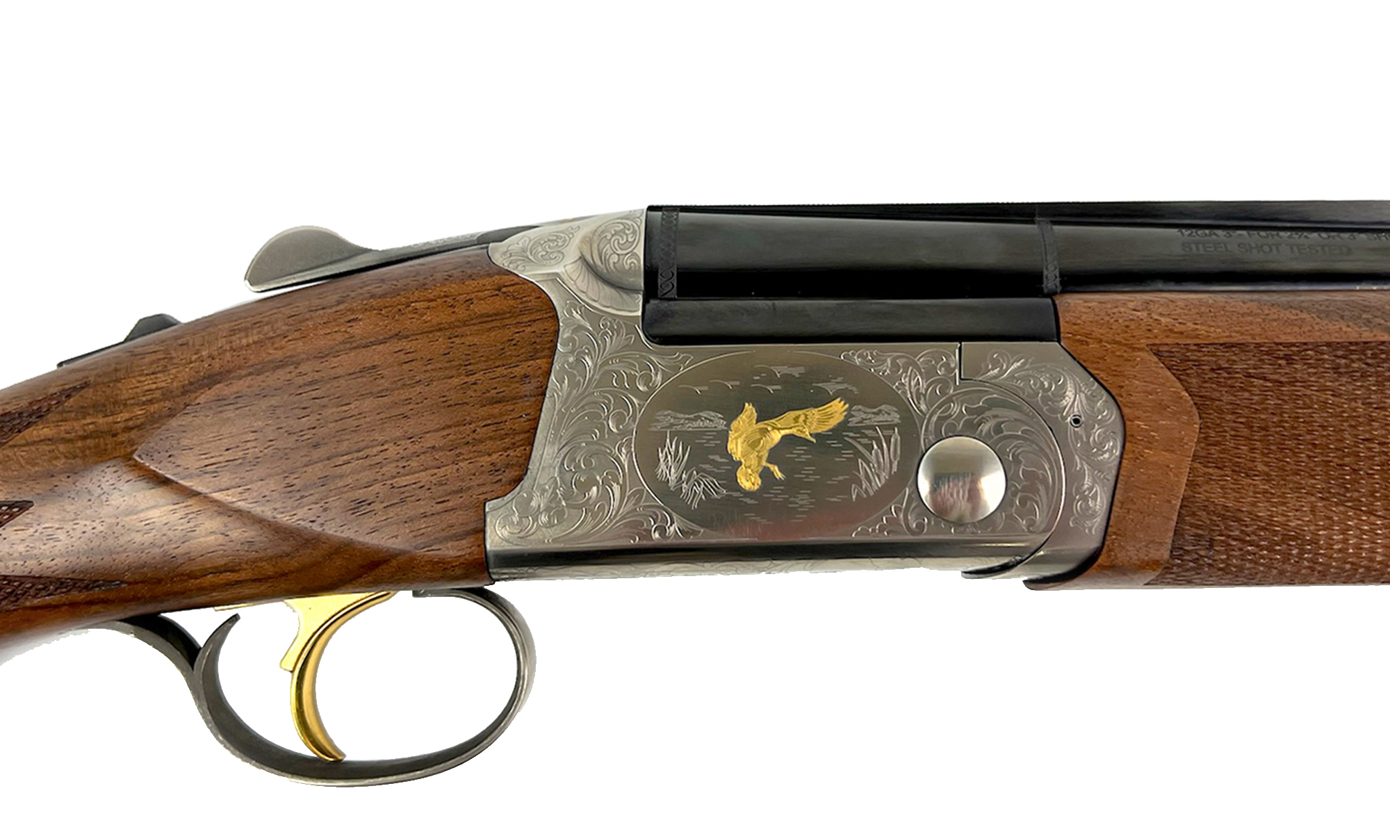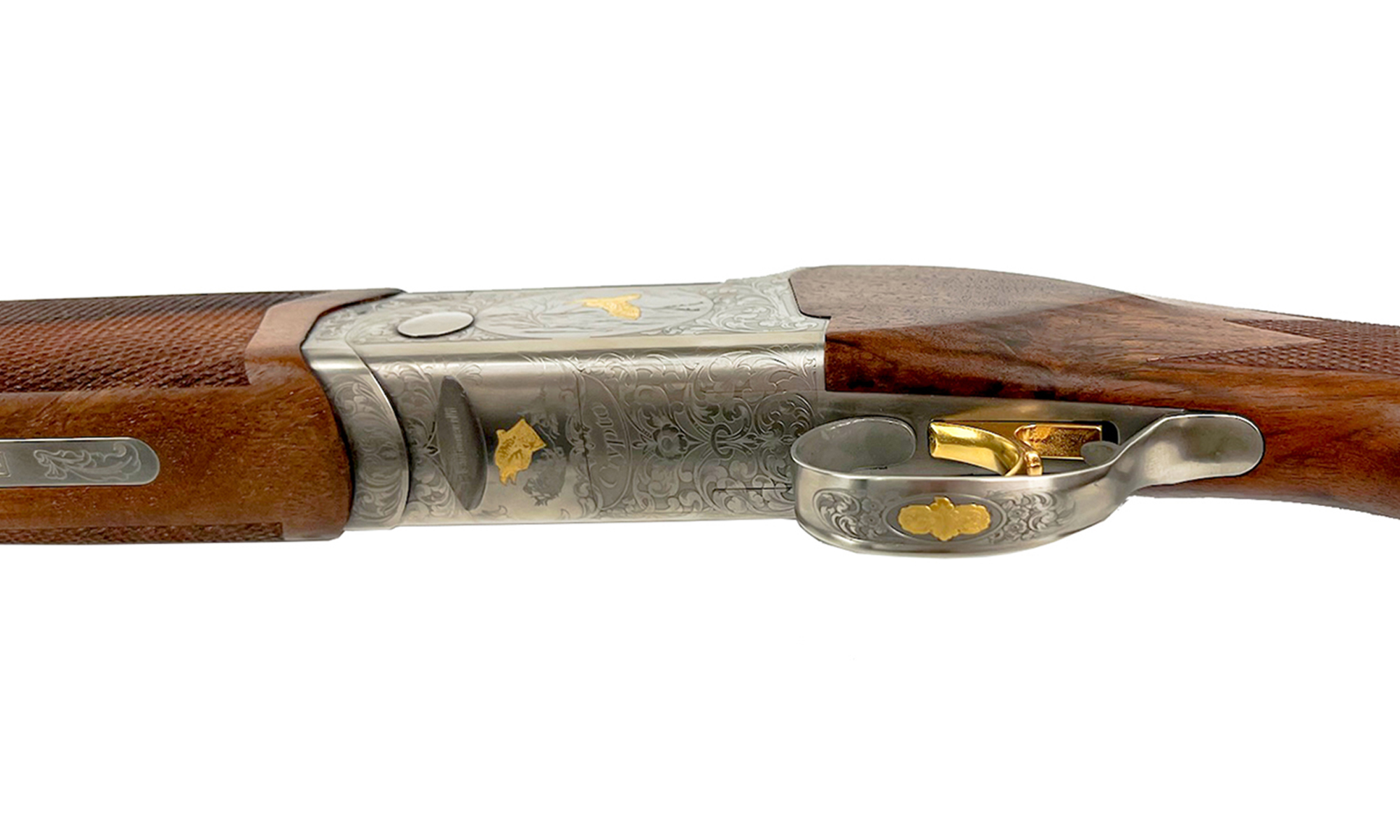 Estetică și Calitate: Bascula argintie este decorată cu gravuri laser reprezentând motive cinegetice subtile. Patul este realizat din lemn de nuc selecționat, oferind o priză ergonomică și un aspect premium.
