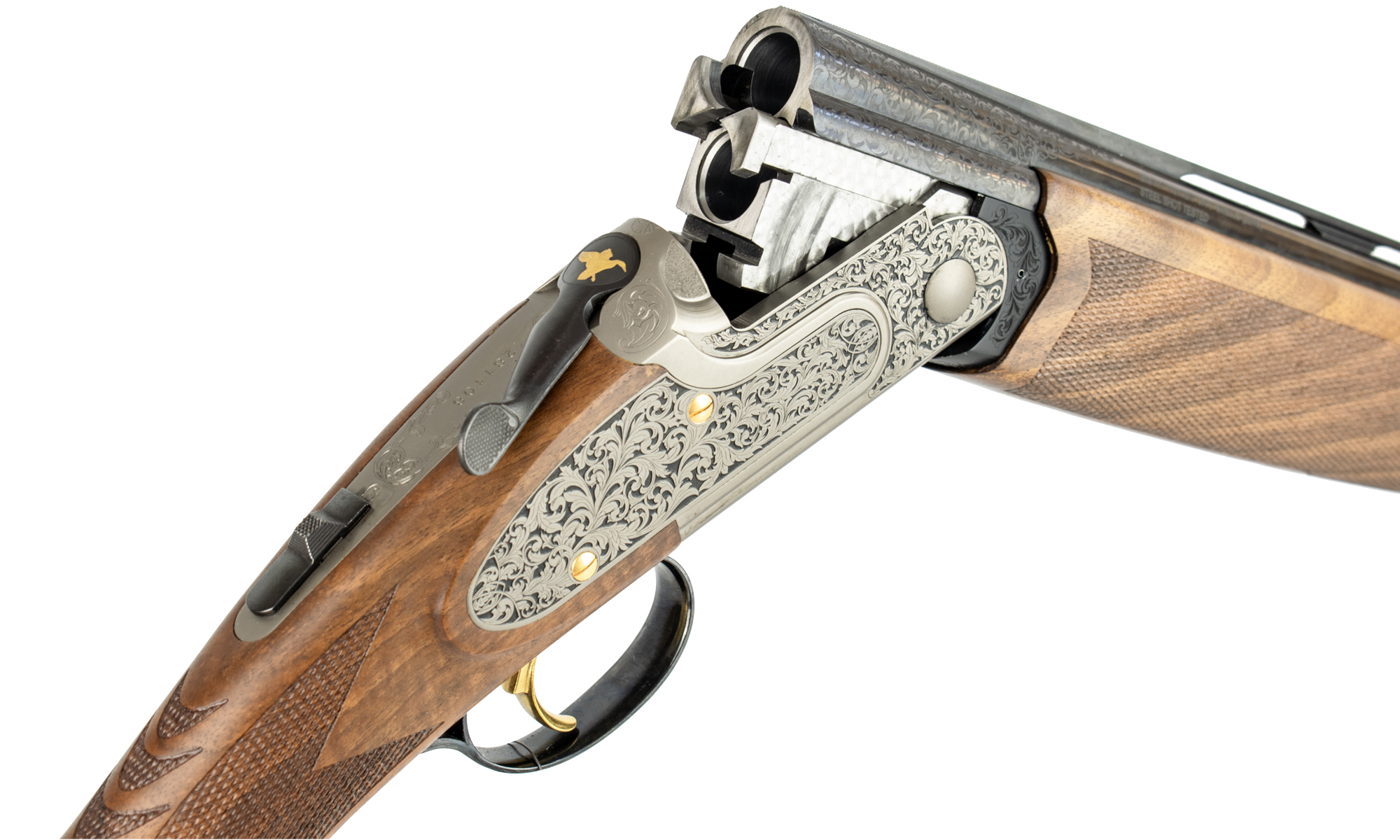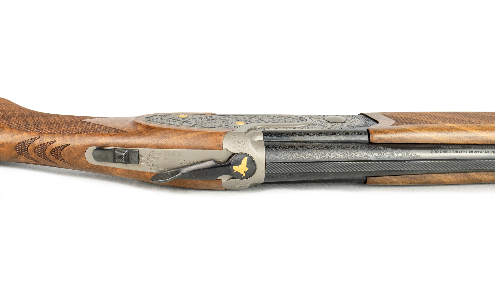 Bascula este decorată cu gravuri florale complexe, realizate cu o atenție deosebită la detalii, completată de un trăgaci auriu ce oferă o notă distinctivă de rafinament. Patul și ulucul sunt fabricate din lemn de nuc selecționat, finisat cu ulei pentru a scoate în evidență textura naturală și pentru a oferi o durabilitate sporită.