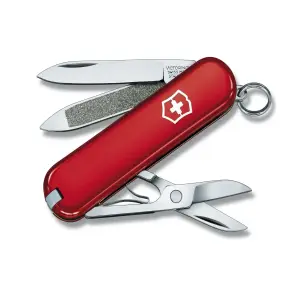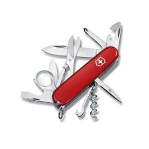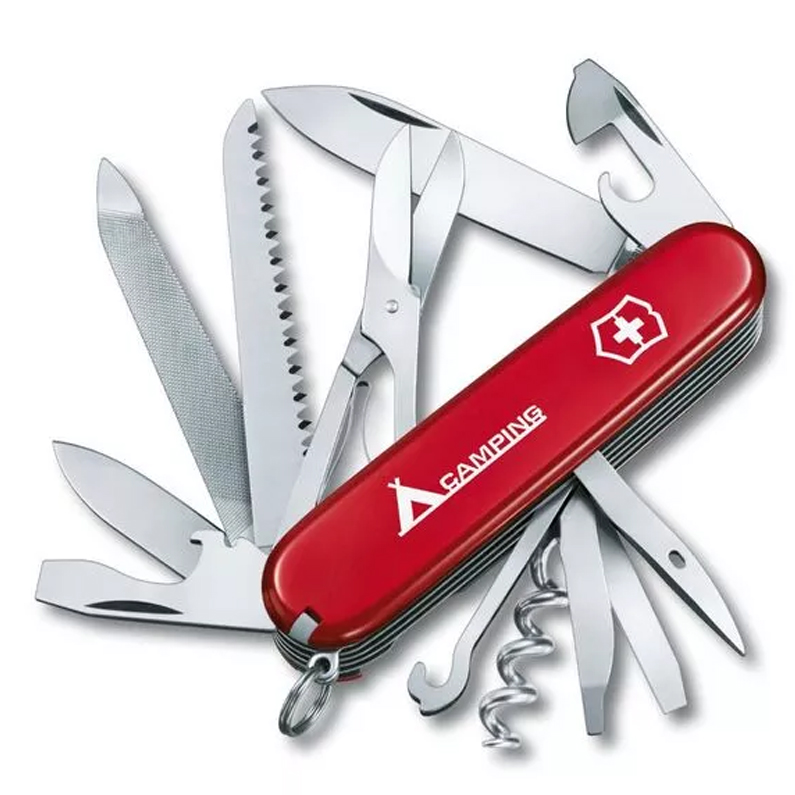 Lamă, mare / Lamă, mică / Tirbușon / Desfăcător de conserve / Șurubelniță 3 mm / Desfăcător de sticle / Șurubelniță 6 mm / Scobitor de sârmă / Șurubelniță 2,5 mm / Pensă, perforator și buzdugan de cusut / Foarfece / Ferăstrău pentru lemn / Pilă de unghii / Curăță unghii / Ferăstrău metalic / Pilă metalică / Cârlig multifuncțional / Daltă 4 mm / Breloc / Pensete / Scobitoare