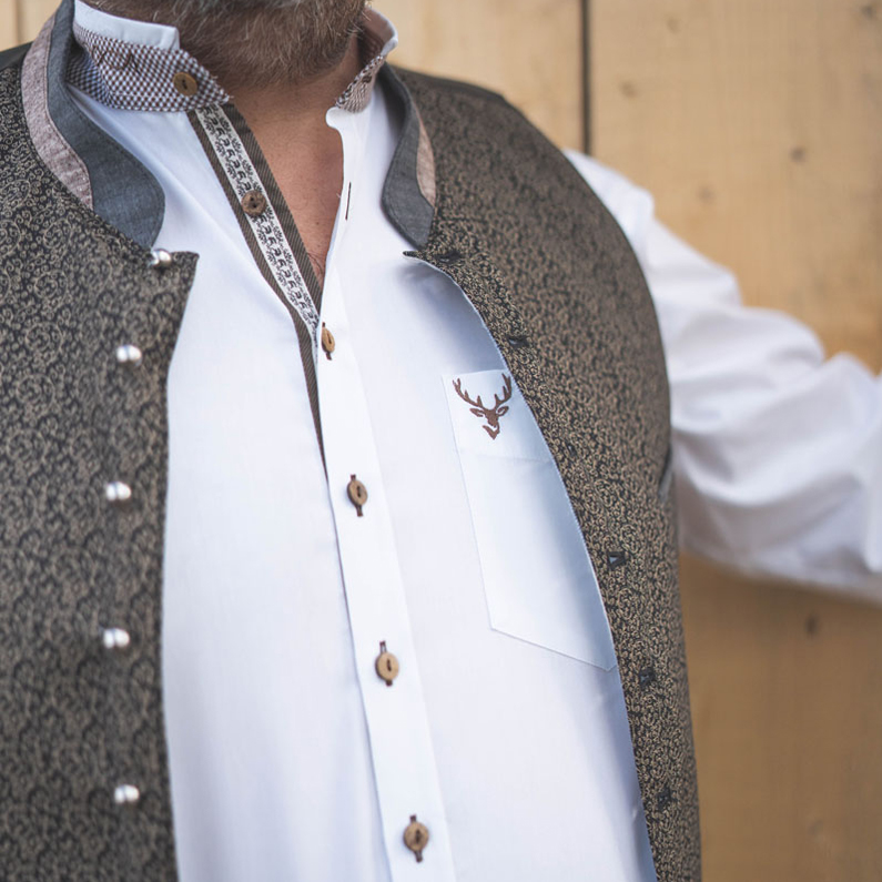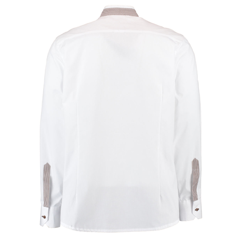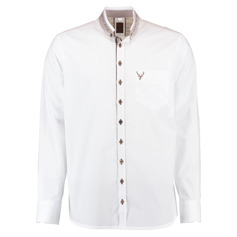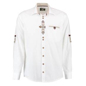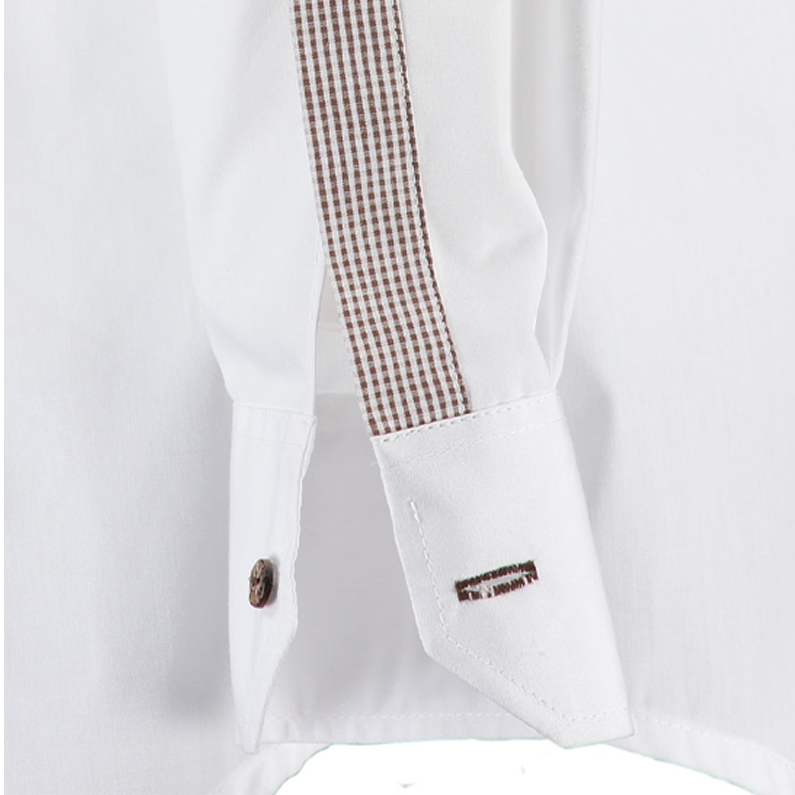 Designul alb curat este completat de gulerul tip Stehkragen (guler rusesc) în nuanță maro și de broderia fină de pe buzunarul aplicat la piept, detalii care subliniază stilul rafinat al brandului OS-Trachten. Croiala slim line evidențiază silueta masculină, iar mâneca lungă (1/1-sleeve) permite purtarea în orice sezon.