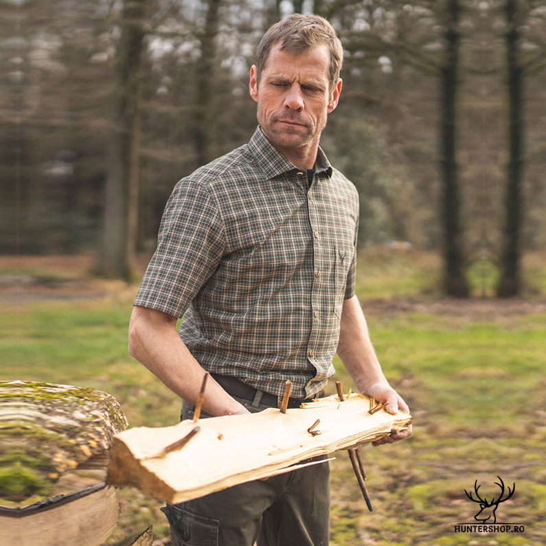 Designul distinct cu guler tip Haifischkragen (cutaway), croială slim și cusături contrastante adaugă o notă modernă și sport. Buzunarul aplicat pe piept este decorat cu broderie, fiind atât practic, cât și elegant. Țesătura în carouri oferă versatilitate – perfectă pentru vânători, pescari sau activități în natură, dar și pentru ținute casual de vară.