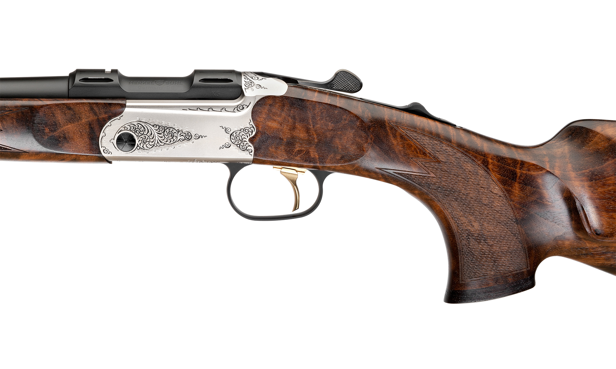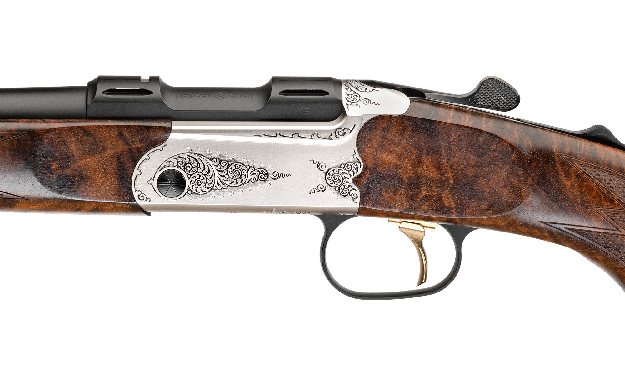 Merkel K5 Arabesque, carabina basculanta gravata, Kipplauf de lux, arma vanatoare munte, carabina monofoc, precizie germana, Merkel K5 pret, arma usoara vanatoare, gravuri arabesque, vanatoare la panda.