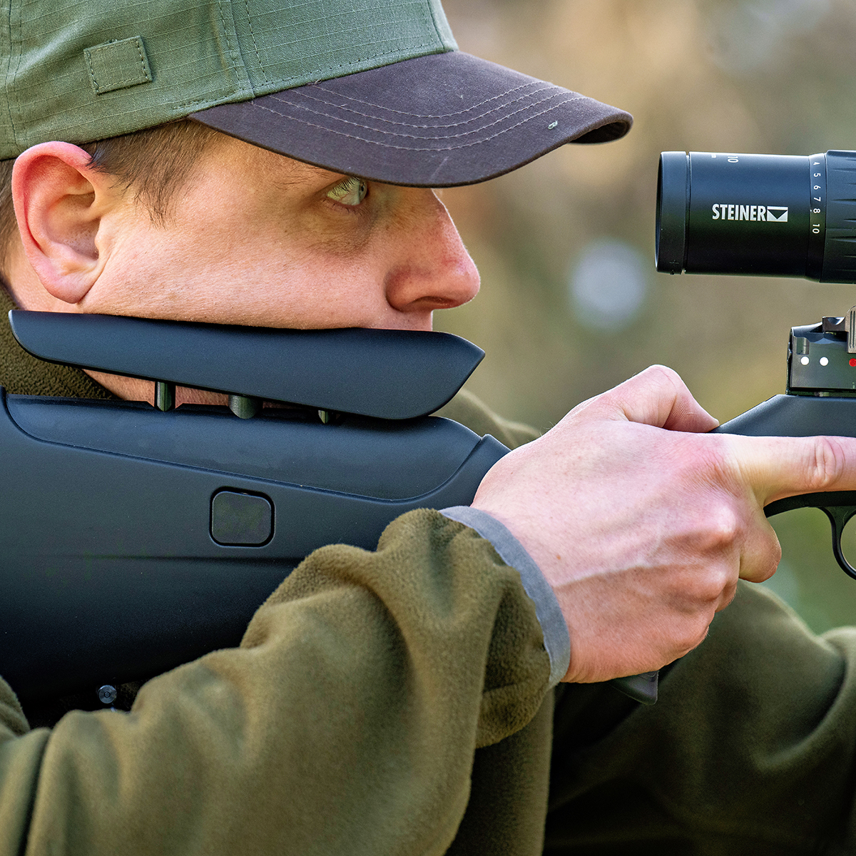 Pat Sintetic Adaptabil: Jaeger EVO este echipată cu un pat compozit dinamic, dotat cu inserții "Soft-Touch" pentru o aderență superioară. Obrazarul reglabil prin buton (spring-loaded) permite vânătorului să își ajusteze linia de ochire instantaneu, indiferent de tipul de lunetă montat.