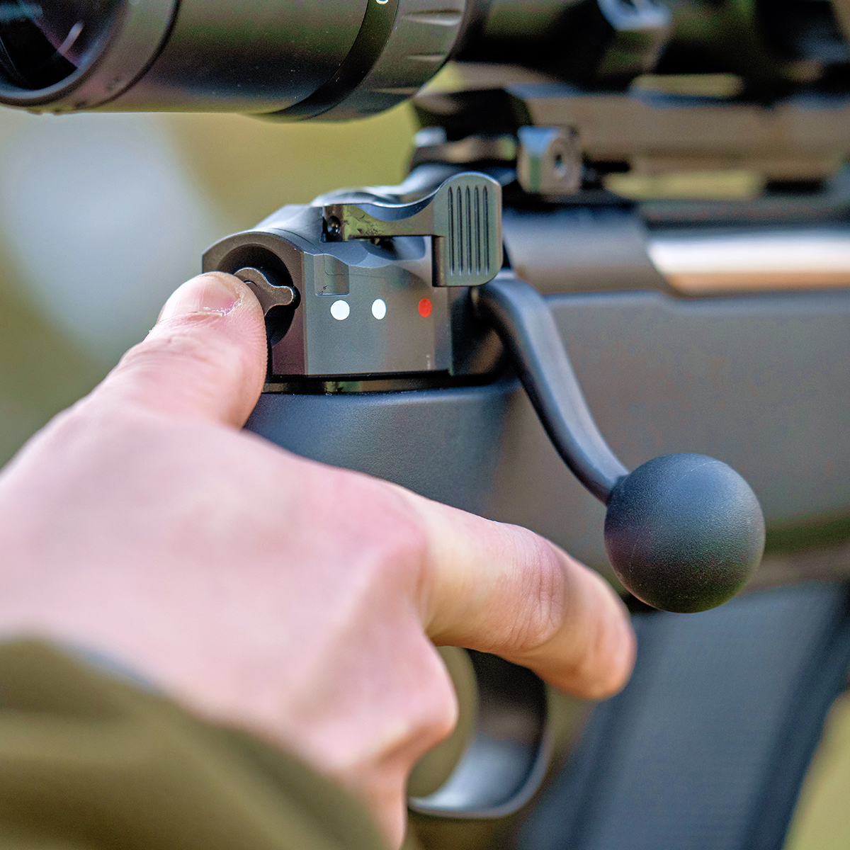 Sistem de Siguranță în 3 Trepte: Oferă un control total asupra percutorului. Pârghia de siguranță permite descărcarea armei în siguranță maximă (percutor blocat, dar închizător mobil) sau blocarea completă a sistemului în timpul deplasărilor prin teren accidentat.
