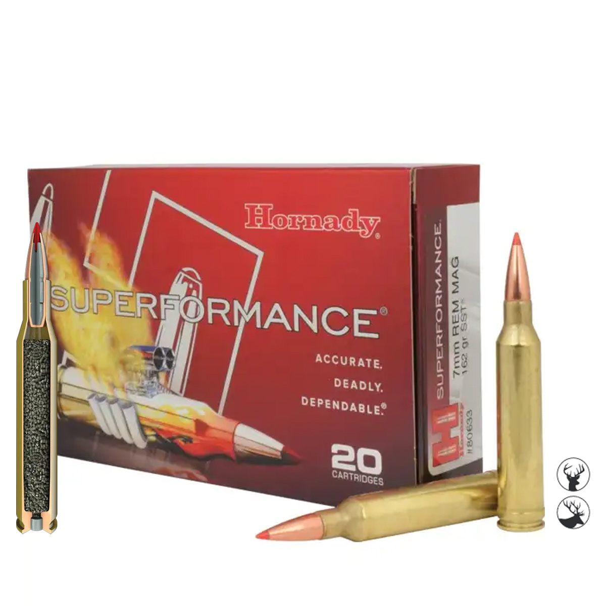 Modelul 80633 este alegerea supremă pentru vânătorul care dorește să transforme calibrul 7mm Rem Mag într-o forță de oprire de neoprit. Masa de 162 grani combinată cu viteza Superformance oferă o energie de peste 4400 Jouli la plecare, fiind capabilă să livreze rezultate etice la distanțe mari asupra mistreților capitali sau cerbilor. Este, practic, una dintre cele mai performante încărcări disponibile pentru acest calibru magnum.
