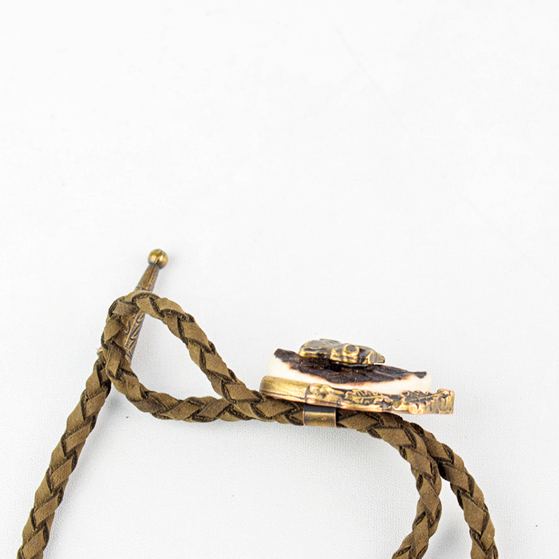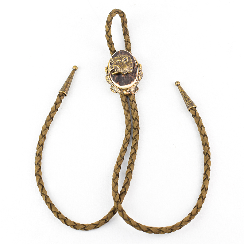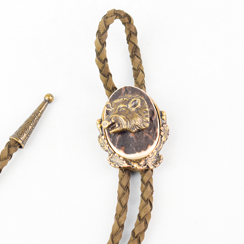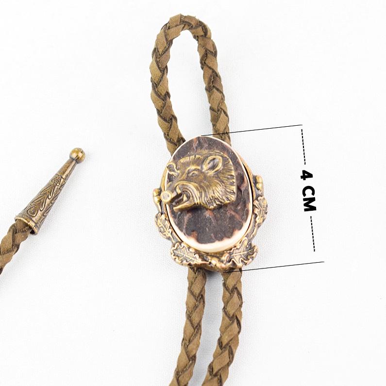 🦌 Descriere: Cravată vânătorească elegantă, realizată prin turnare din alamă și corn de cerb natural, cu detalii fine și finisaj autentic. Snurul este din piele naturală împletită, prevăzut cu capete metalice decorative. Piesa centrală prezintă un motiv vânătoresc clasic: cap de mistreț în profil, simbol al forței și al tradiției cinegetice.