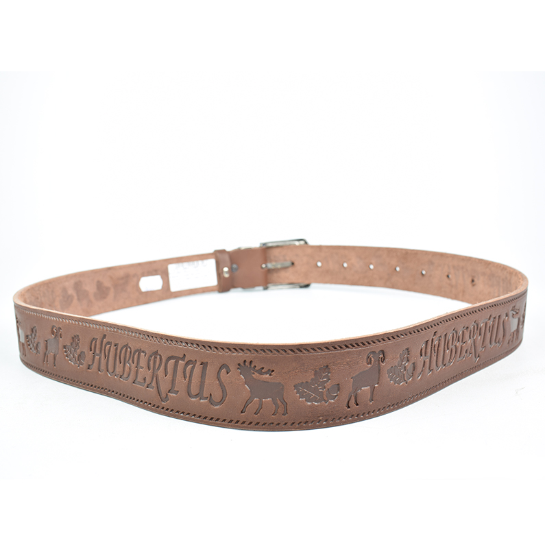 Curea de pantaloni din piele „Hubertus” cu insignă din cerb este un accesoriu elegant și rezistent, conceput special pentru pasionații de vânătoare sau iubitorii de stil tradițional. Fabricată din piele naturală de înaltă calitate, această curea impresionează prin gravura decorativă cu motive vânătorești și inscripția „HUBERTUS”, la care se adaugă o insignă metalică distinctivă cu cerb pe cataramă, ce simbolizează noblețea și spiritul naturii.