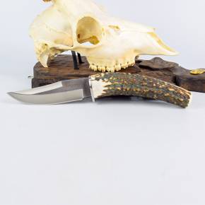 Mânerul de 11,5 cm este confecționat din corn natural de cerb (stag horn), oferind o prindere sigură și confortabilă. Garda este din oțel inoxidabil, protejând mâna utilizatorului în timpul folosirii. Cuțitul cântărește 290 grame, iar împreună cu teaca din piele maro de 80 grame, greutatea totală este de 370 grame. Lungimea totală a cuțitului este de 27 cm.