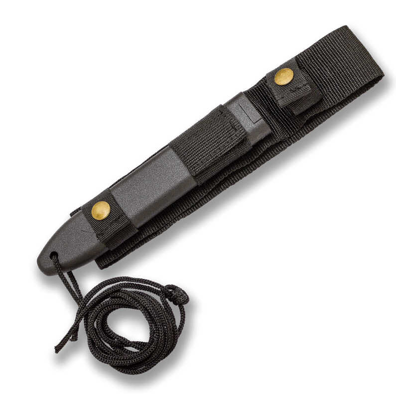 Mânerul ergonomic este fabricat din ABS rezistent la șocuri și intemperii, iar jelecul dublu previne alunecarea mâinii, având și funcția practică de deschizător de sticle. Întregul cuțit are o construcţie robustă Full Tang, pentru o rezistență superioară la îndoire sau rupere. Pe lângă performanțele funcționale, pachetul include o teacă din plastic rezistentă, prevăzută cu clips pentru fixare comodă pe curea sau rucsac.