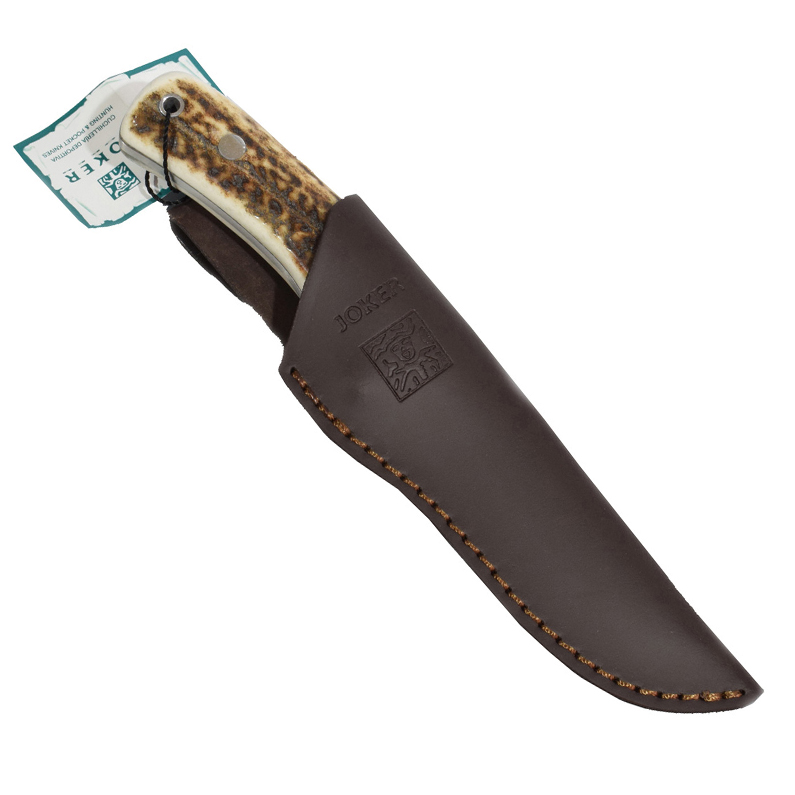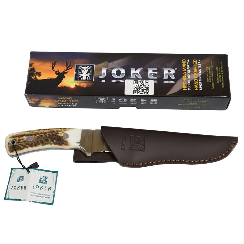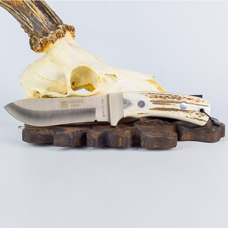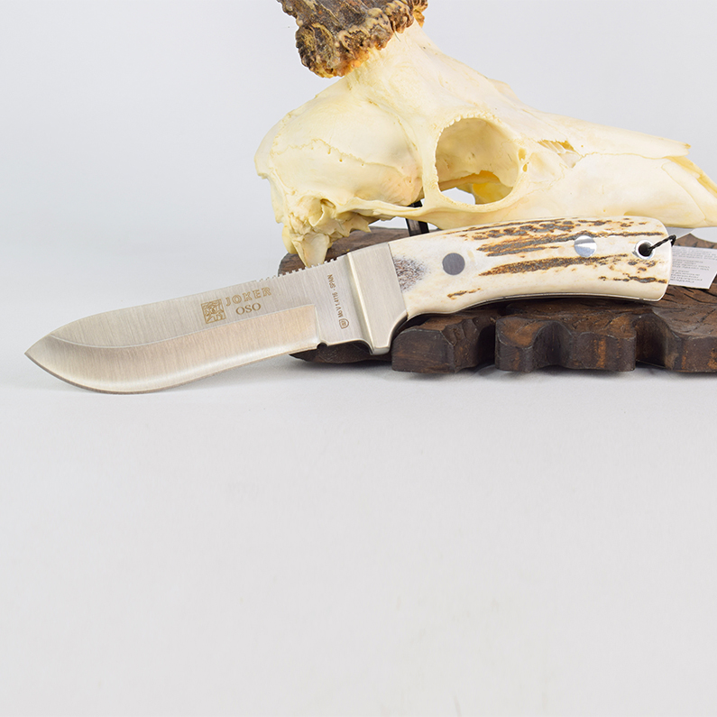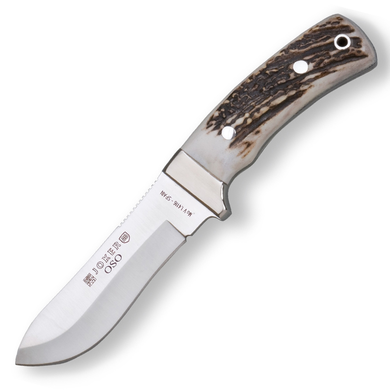 Cumpără Joker Oso CC49, cuțit de vânătoare full tang fabricat în Spania. Lamă din oțel Mova 1.4116 de 12 cm și mâner autentic din corn de cerb. Ideal pentru camping și bushcraft.