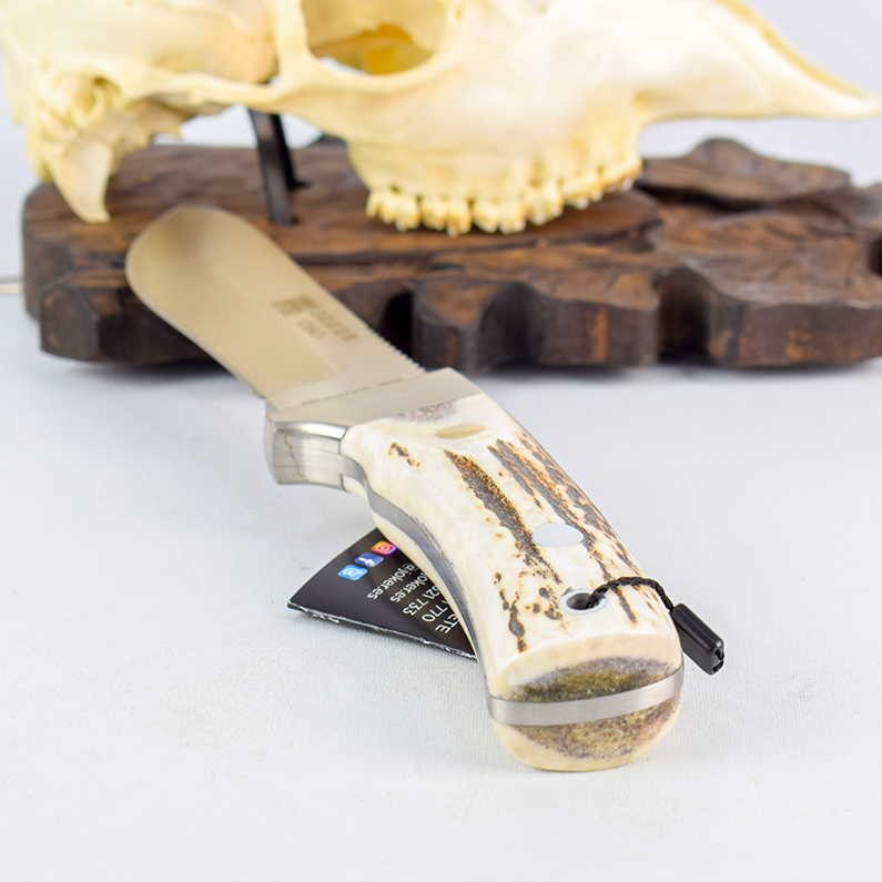 Mâner Nobil din Corn de Cerb: Mânerul de 11.5 cm este realizat din corn de cerb autentic, oferind nu doar un aspect rustic deosebit, ci și o priză sigură și ergonomică.