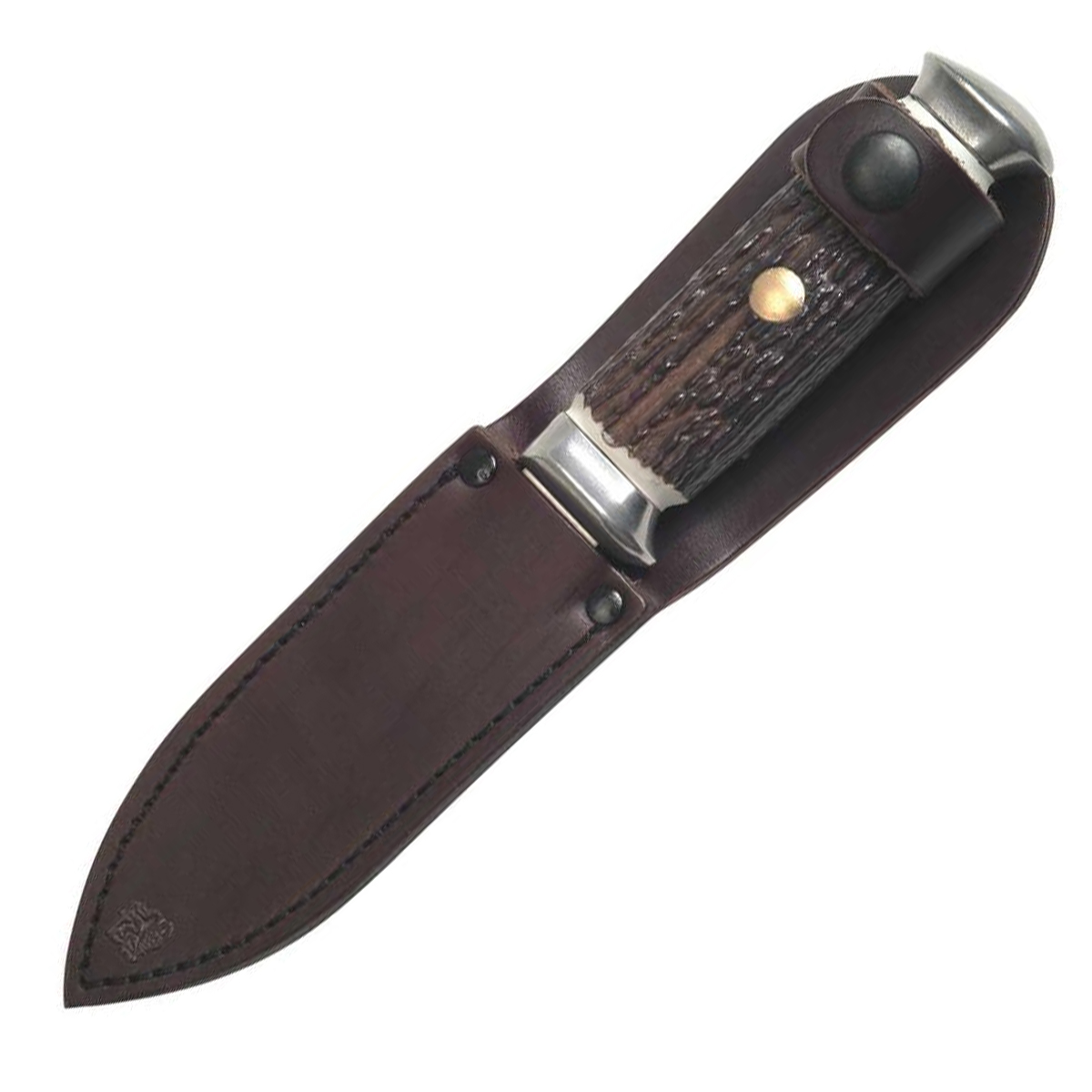Teacă de Piele Inclusă: Cuțitul vine echipat cu o teacă din piele naturală neagră, asigurând o protecție optimă a lamei și posibilitatea purtării sigure la centură.