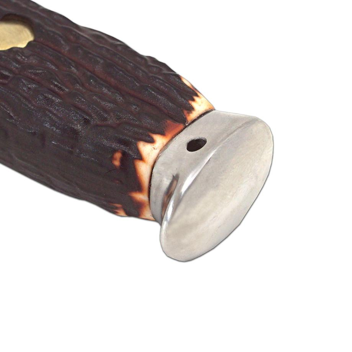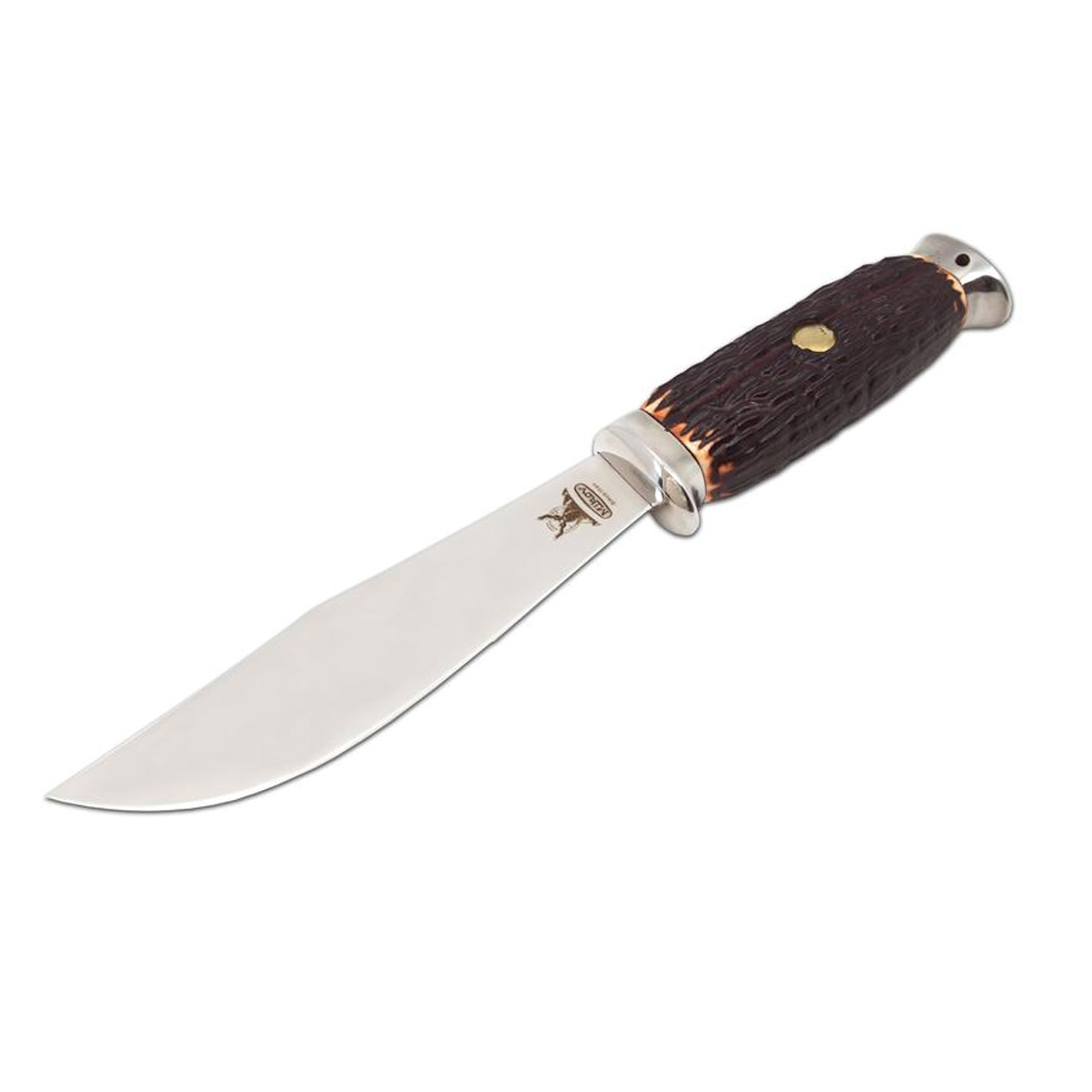 Mânerul este fabricat dintr-un polimer rezistent, cu o textură ce imită perfect cornul de cerb, asigurând o priză sigură și confortabilă chiar și în condiții de umiditate, fără a necesita întreținerea pretențioasă a materialelor naturale.