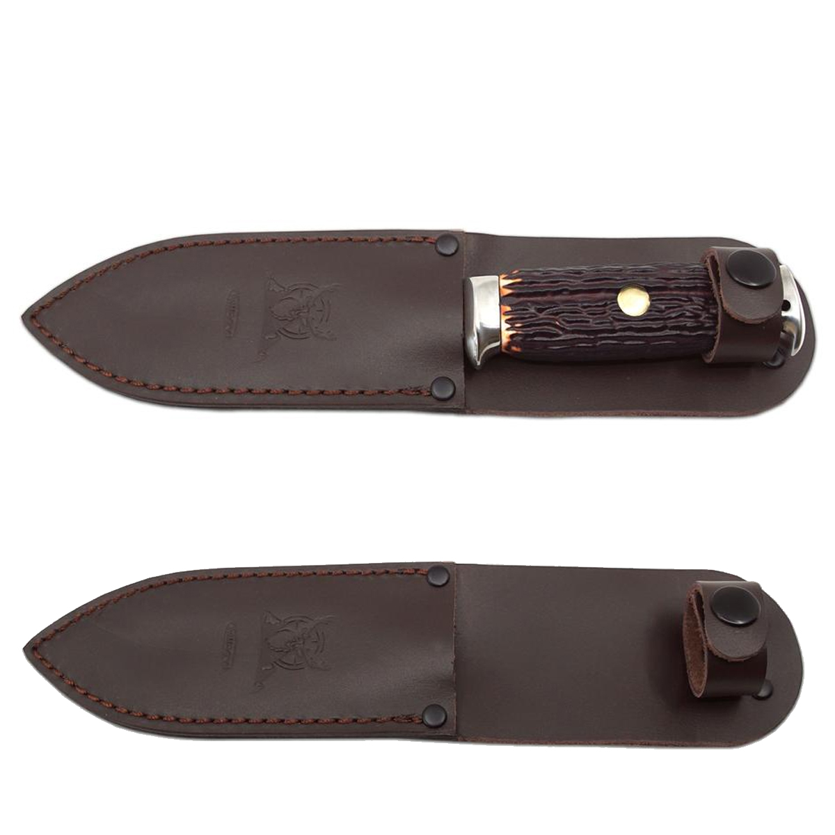 Accesorii Incluse: Cuțitul vine însoțit de o teacă din piele naturală de culoare maro, prevăzută cu prindere pentru curea, pentru un transport sigur și elegant.