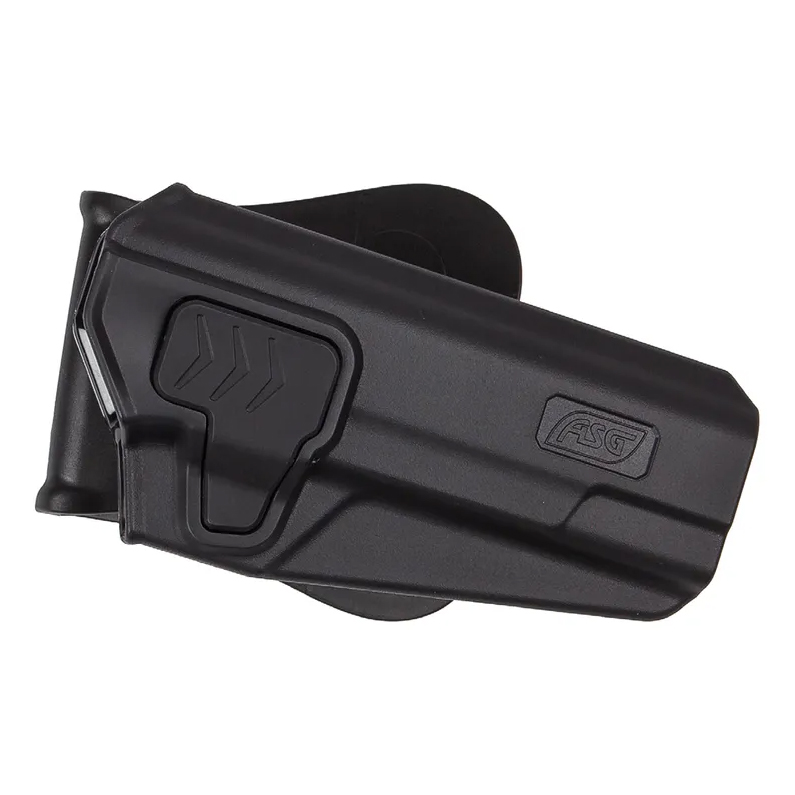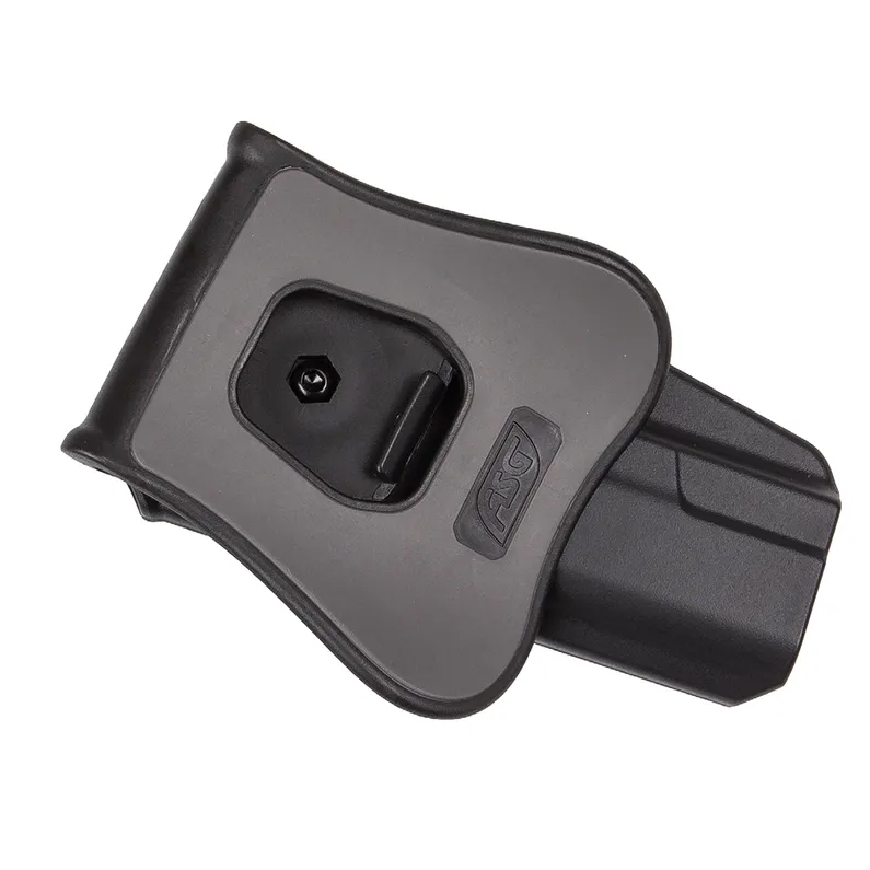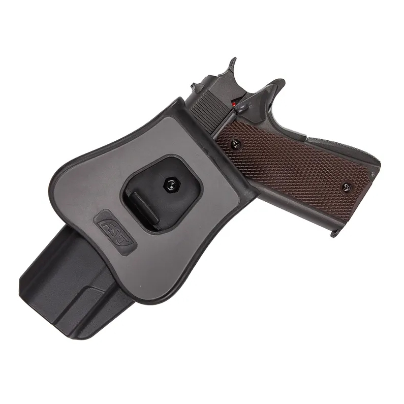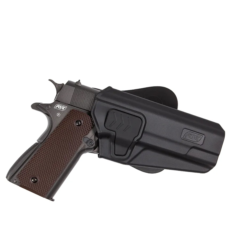 Mecanismul de blocare cu levier mare asigură fixarea fermă a replicii, chiar și în situații solicitante. Tocul este livrat standard cu prindere tip paddle, compatibilă cu curele de până la 42 mm sau cu purtare direct pe pantaloni, pentru un port discret. Spatele cauciucat al paddle-ului oferă confort și aderență sporită.