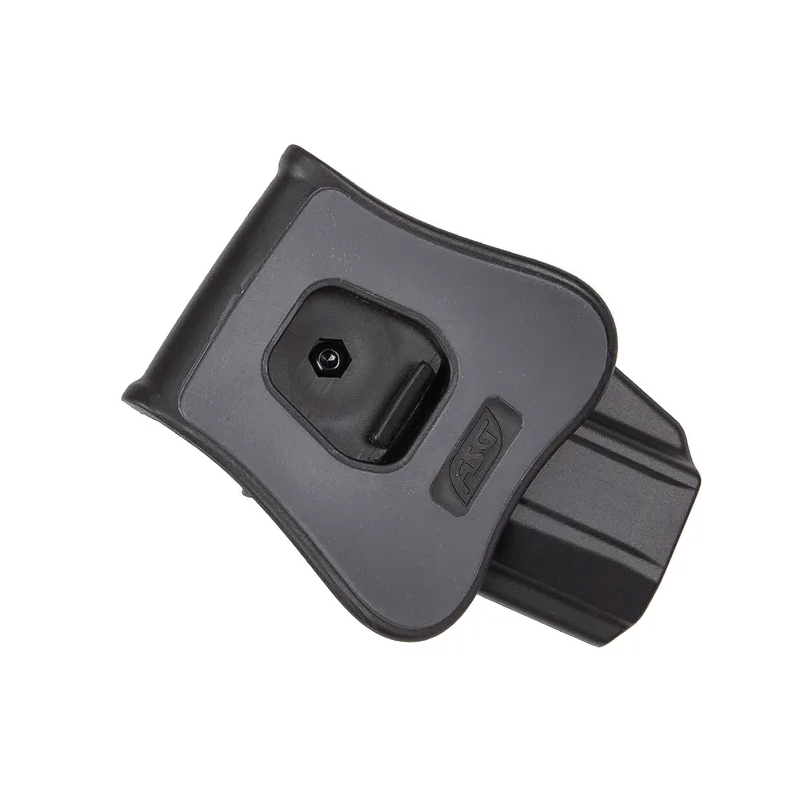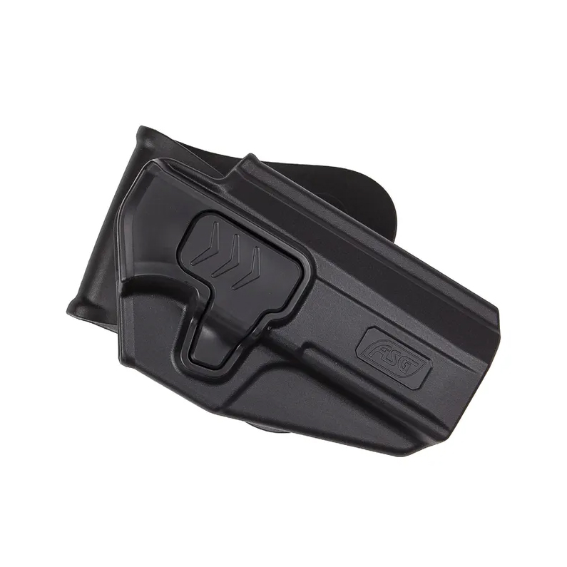 Mecanismul de blocare cu levier mare asigură fixarea fermă a replicii, chiar și în situații solicitante. Tocul este livrat standard cu prindere tip paddle, compatibilă cu curele de până la 42 mm sau cu purtare direct pe pantaloni, pentru un port discret. Spatele cauciucat al paddle-ului oferă confort și aderență sporită.