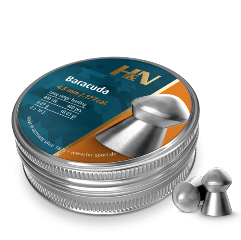 Alicele H&N Baracuda .177 cal (4,5 mm, 10,65 gr) sunt proiectate pentru performanțe de top la tir sportiv și vânătoare pe distanțe mari. Cu un design aerodinamic de primă clasă, acestea asigură un impact puternic și penetrare eficientă, precum și grupaje strânse datorită compoziției speciale care reduce depunerile de plumb în țeavă.