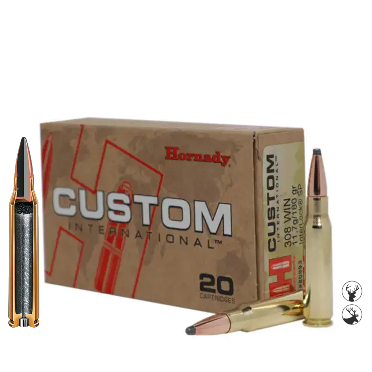 muniție .308 win 180 gr, Hornady 80993, Hornady Custom International, cartușe vânătoare mistreț, muniție Hornady Oradea, pret munitie 308 win.