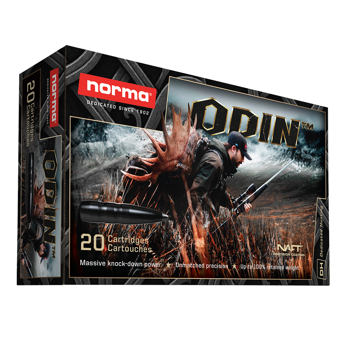 Performanță și Tehnologie: Proiectilul Odin utilizează o construcție clasică cu nucleu de plumb expus la vârf, ceea ce facilitează o deformare ciupercată imediată după contactul cu vânatul. Această expansiune rapidă creează un canal de rană larg, livrând un șoc terminal puternic necesar pentru a ancora vânatul rapid pe loc. Designul mantalei este studiat pentru a asigura o retenție de masă echilibrată, permițând proiectilului să pătrundă prin țesuturi dense fără a se fragmenta prematur.