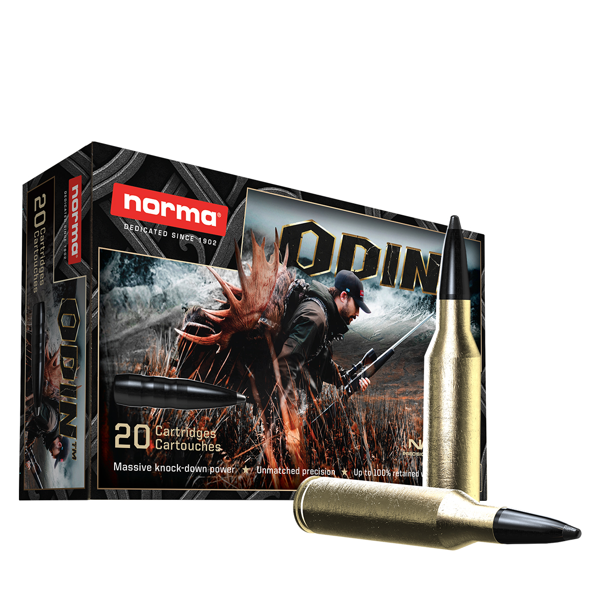 Performanță și Tehnologie: Proiectilul Odin folosește un design clasic cu nucleu de plumb expus, care inițiază o expansiune rapidă și violentă în momentul impactului. Datorită masei de 14.9 grame, glonțul atinge viteze superioare variantelor standard mai grele, ceea ce rezultă într-un transfer de energie hidrodinamică masiv către țesuturi. Manta de cupru controlează deformarea, permițând glonțului să se transforme într-o formă de ciupercă lată care maximizează canalul de rană și reduce riscul ca vânatul să părăsească locul impactului.