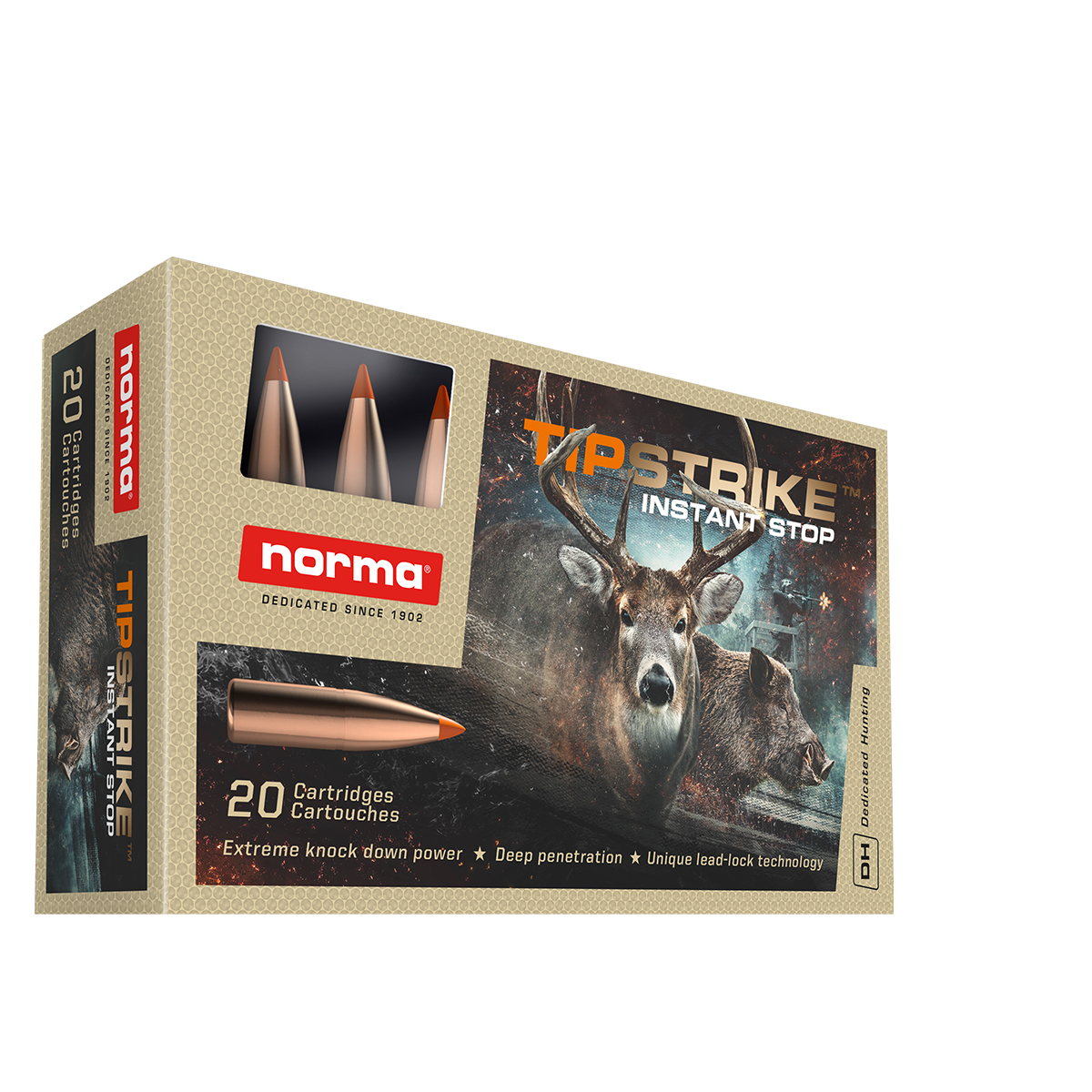 Glonțul Tipstrike dispune de un vârf de polimer care nu doar îmbunătățește balistica, dar asigură și inițierea imediată a expansiunii la impact. Caracteristica distinctivă este forța de șoc masivă: cămașa proiectilului este subțire în partea frontală pentru o fragmentare controlată și ranforsată în partea posterioară printr-un sistem de blocare mecanică (lead lock). Această construcție permite glonțului să livreze un transfer de energie uriaș în primele straturi de țesut, menținând în același timp integritatea bazei pentru o penetrare suficientă.
