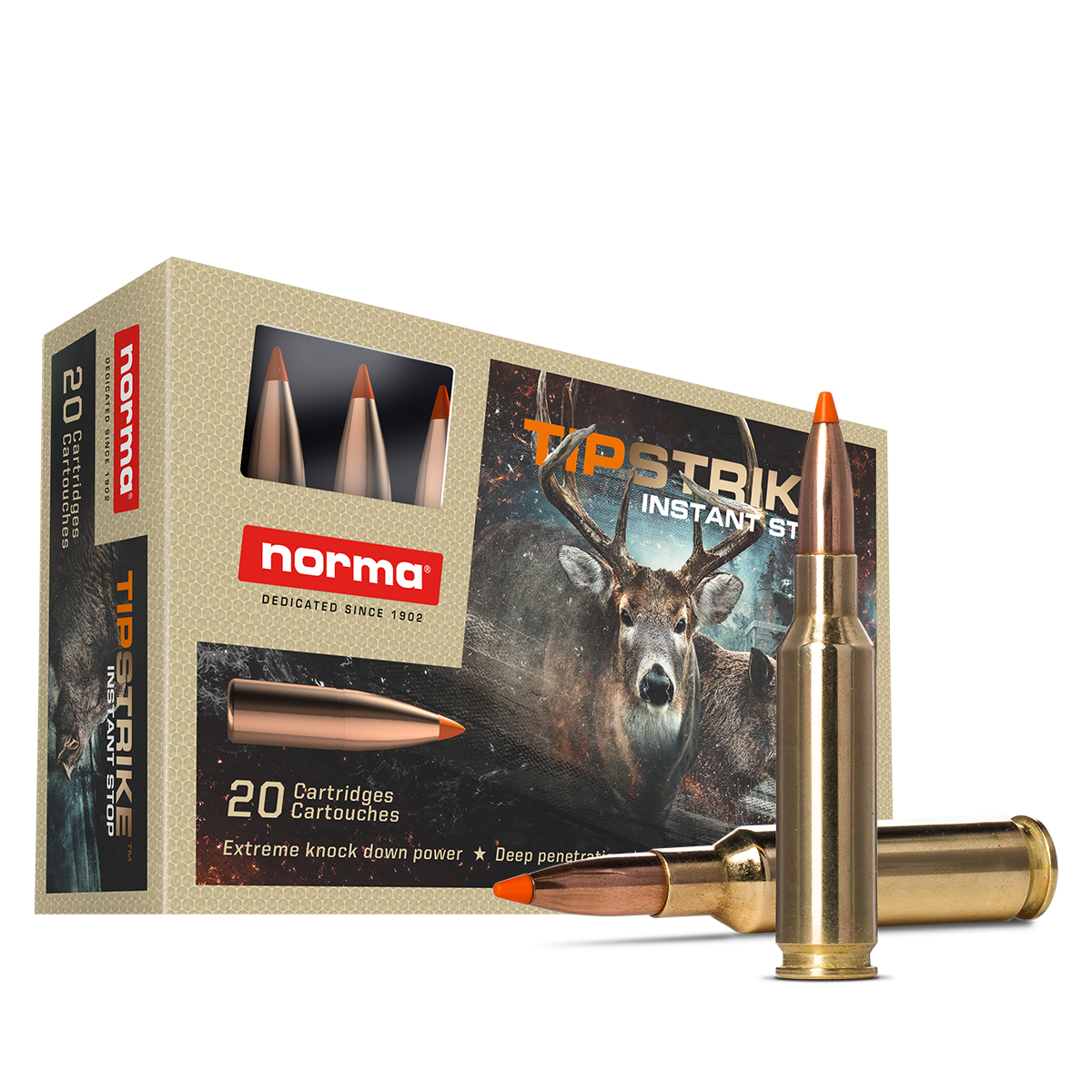 Proiectilul Tipstrike este echipat cu un vârf de polimer care nu doar că îmbunătățește coeficientul balistic pentru o traiectorie razantă, dar asigură și inițierea imediată a expansiunii. Caracteristica sa definitorie este transferul masiv de energie: cămașa este subțire în partea frontală pentru o fragmentare rapidă și ranforsată la bază printr-un sistem de blocare mecanică (lead lock). Această construcție permite glonțului să producă un șoc hidrodinamic puternic în primele straturi de țesut, menținând în același timp suficientă masă pentru a penetra adânc.