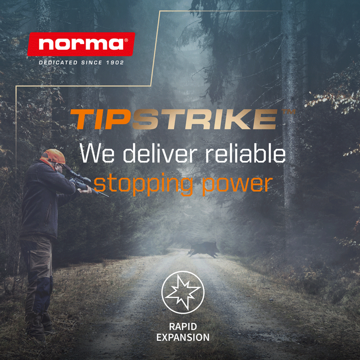 Performanță și Tehnologie: Proiectilul Tipstrike este echipat cu un vârf de polimer care nu doar că îmbunătățește aerodinamica pentru o traiectorie razantă, dar asigură și inițierea imediată a expansiunii la impact. Designul său structural include o manta de cupru subțire în partea frontală, responsabilă pentru o fragmentare rapidă și violentă, producând un șoc hidrodinamic masiv. Pentru a asigura o penetrare adâncă, chiar și după transferul inițial de energie, baza proiectilului dispune de o blocare mecanică (lead-lock) care menține integritatea nucleului de plumb.