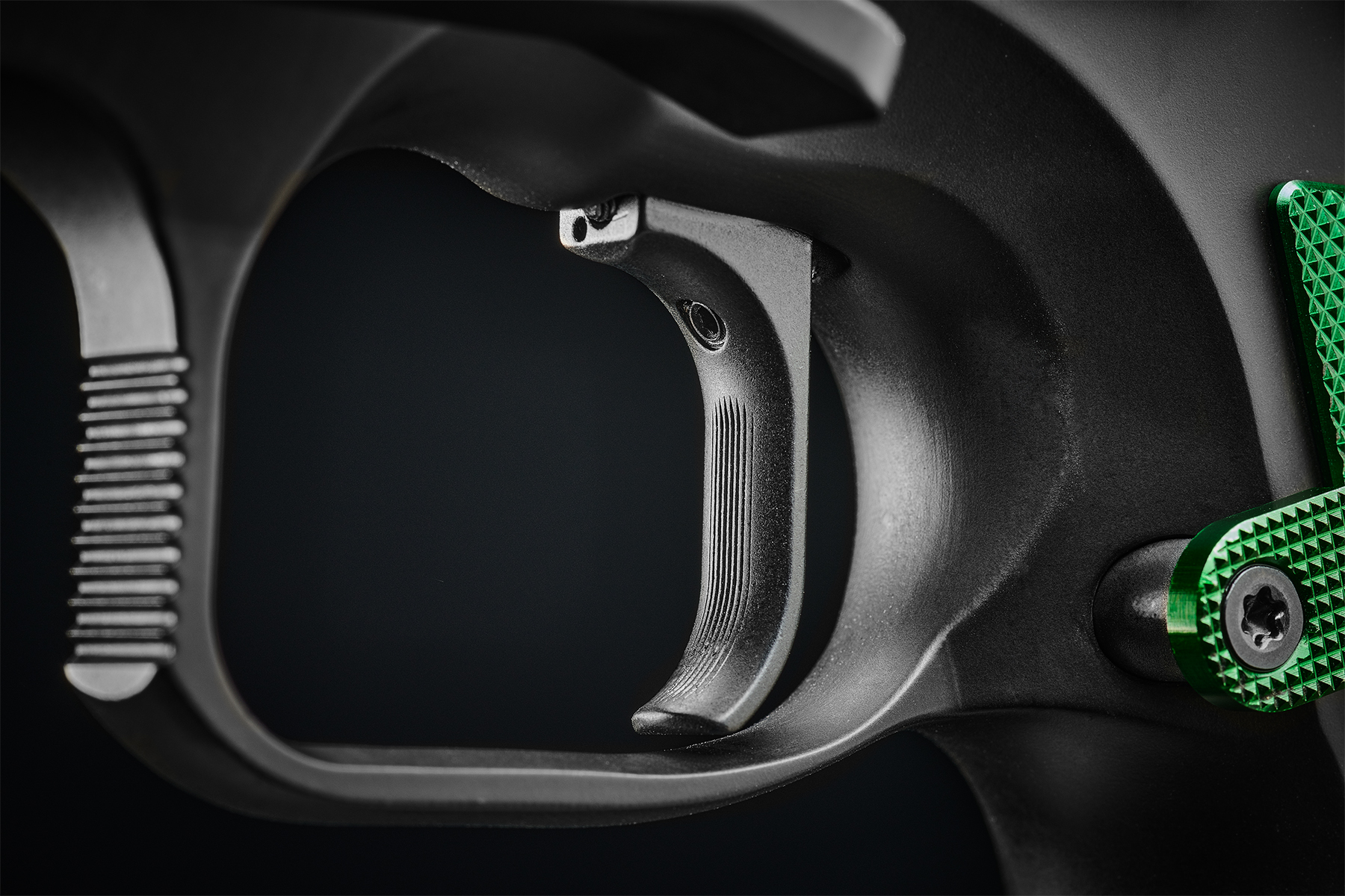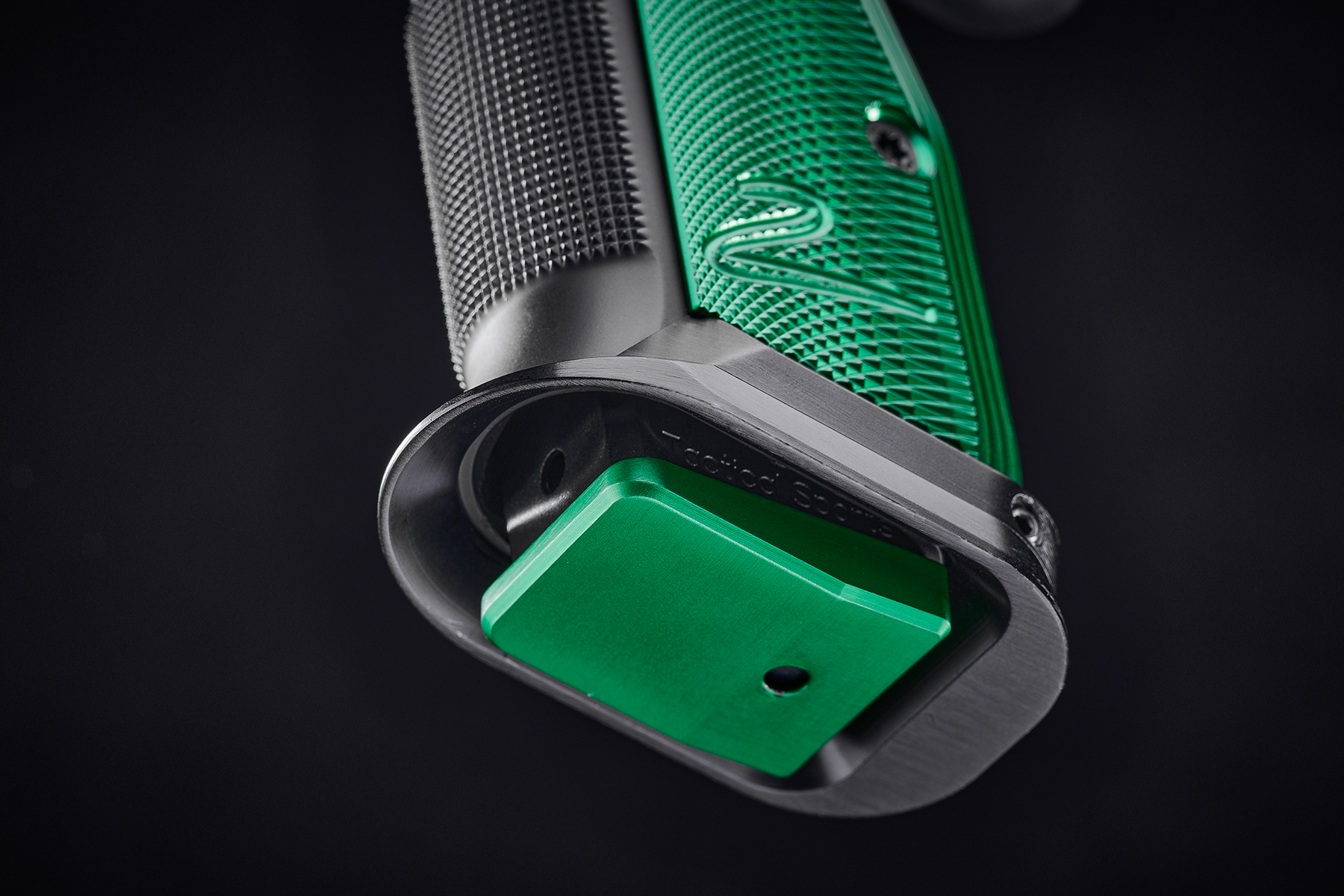 Ergonomie și Design: Mânere plate din duraluminiu anodizat verde și magwell asortat, care facilitează reîncărcările rapide sub presiune.