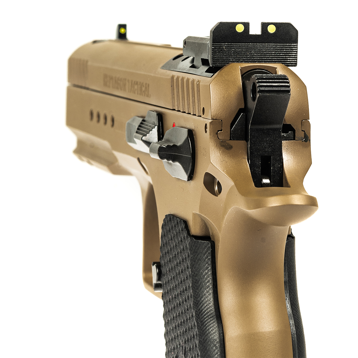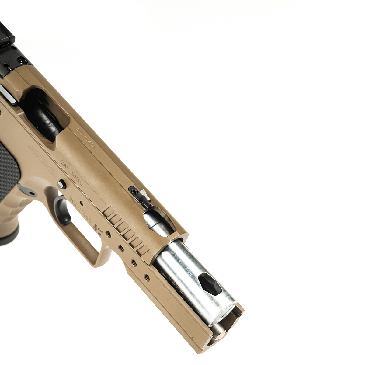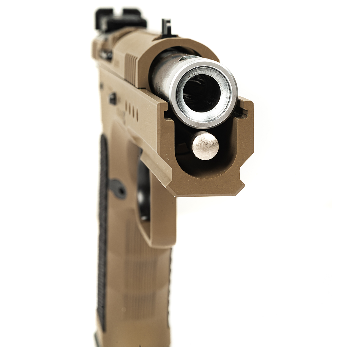 Finisaj FDE (Flat Dark Earth): Un strat de protecție extrem de rezistent la uzură, coroziune și reflexii, oferind armei un aspect tactic modern și o camuflarea optimă.