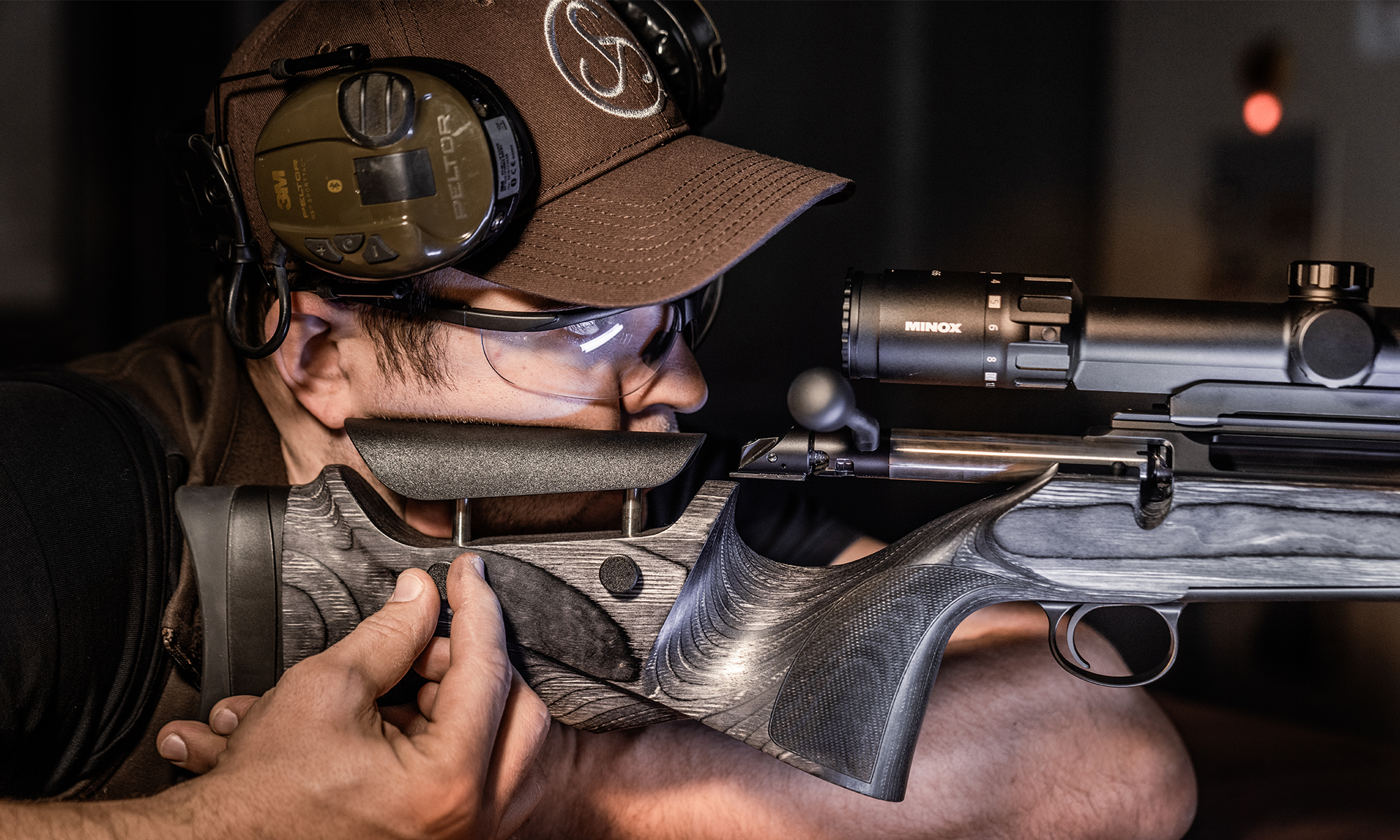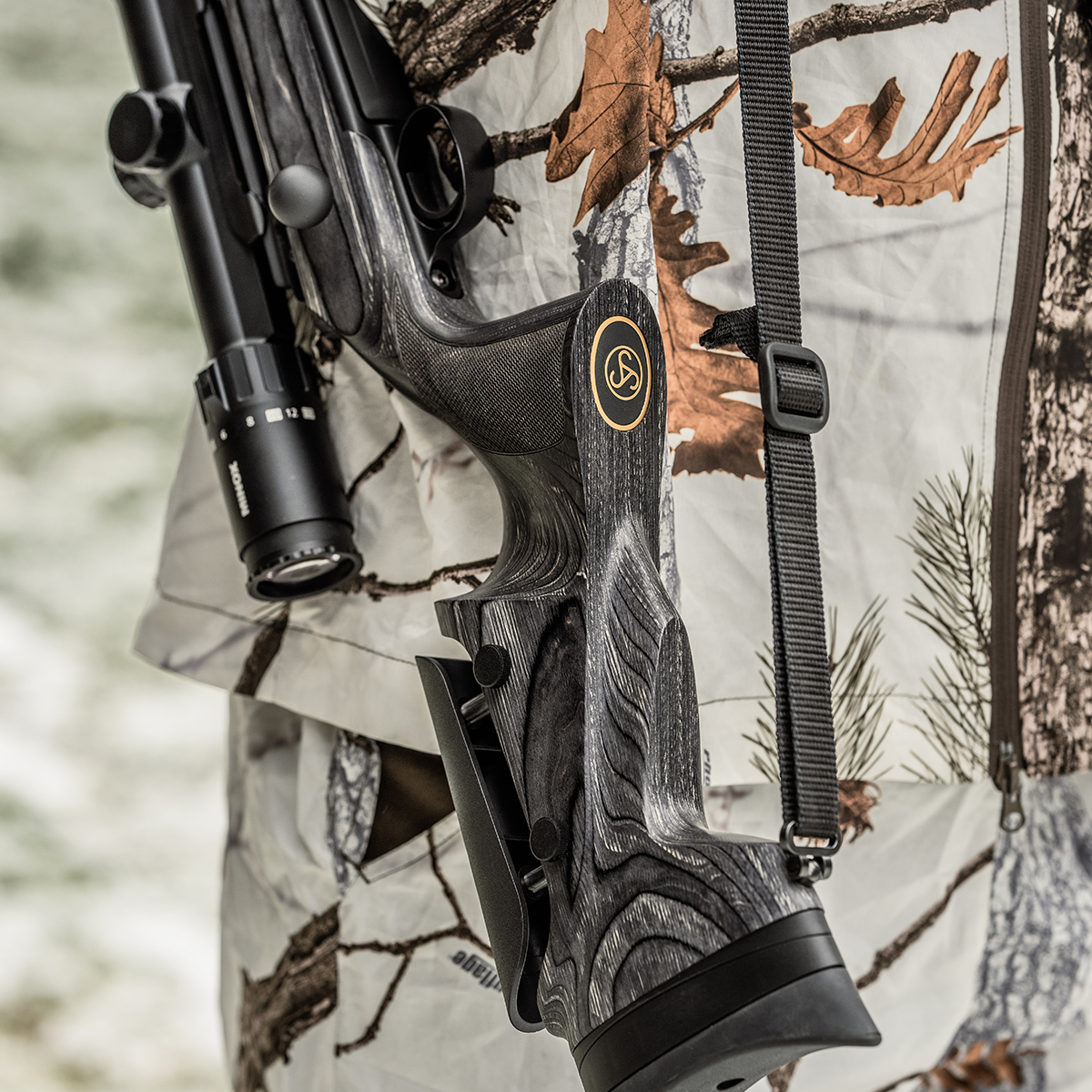 Pat din lemn laminat gri: Patul este realizat dintr-un stratificat rezistent la condiții meteo adverse și torsiune, oferind o platformă extrem de rigidă. Designul ergonomic include un obrazar reglabil și un talon ajustabil (pe înălțime și lateral), permițând adaptarea perfectă la anatomia trăgătorului pentru o poziție de tragere culcat sau de pe suport.