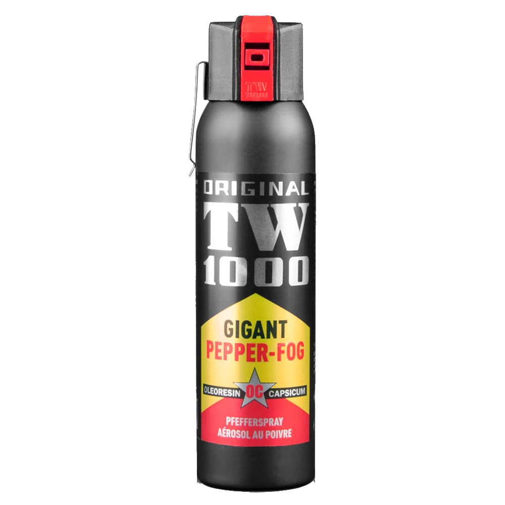 Spray de autoapărare cu piper TW1000 Pepper Fog Gigant, 150 ml – jet conic, rază 3–4 m, capac de protecție și clemă metalică. Ideal pentru autoapărare și utilizare profesională.