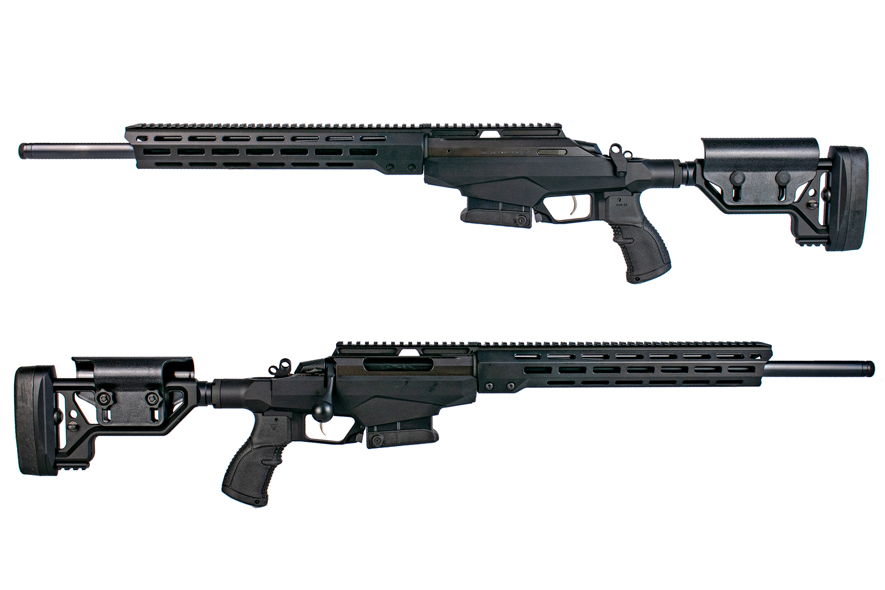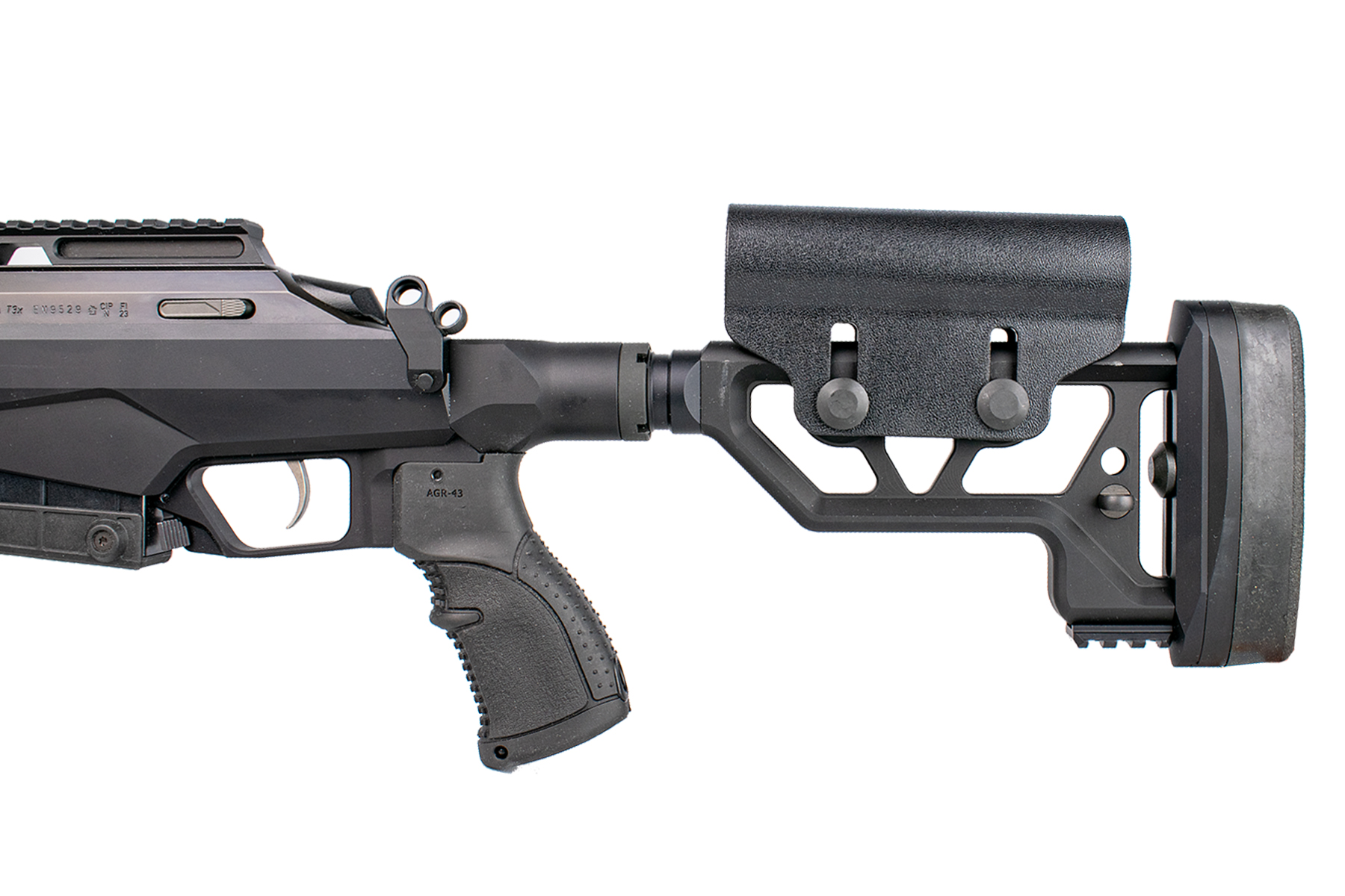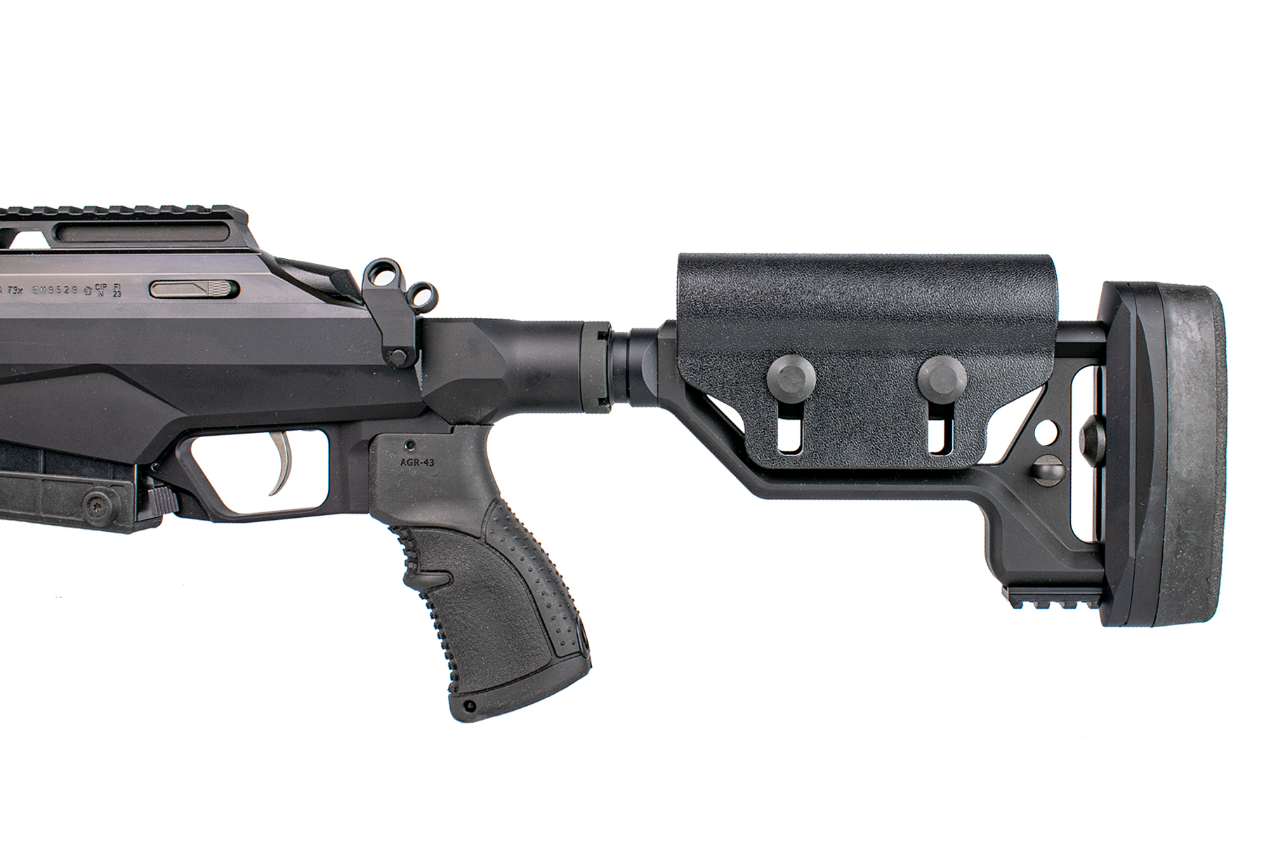 Construită pe șasiul modular din aluminiu, T3x Tact A1 asigură o rigiditate structurală excepțională. Țeava de 20 inch (508 mm), forjată la rece, dispune de un raport de demultiplicare (rate of twist) de 1:8", ideal pentru stabilizarea proiectilelor mai grele, specifice tragerilor de precizie. La capătul țevii regăsim un filet 5/8"-24, gata pentru montarea diverselor dispozitive de gura țevii.