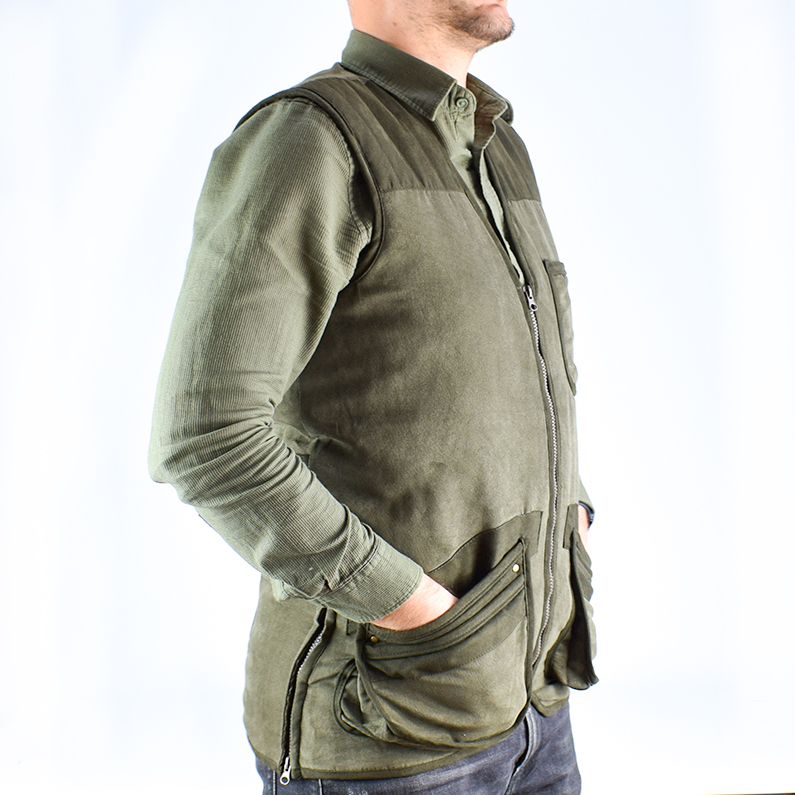 Vesta M-Tramp Herne Mikrokord, verde, este o vestă de vânătoare elegantă, realizată din microfibră dens țesută (mikrokord), foarte rezistentă și plăcută la purtat. Dispune de fermoar frontal dublu (dual slider) pentru o utilizare facilă și de buzunare mari, confortabile pentru depozitare.